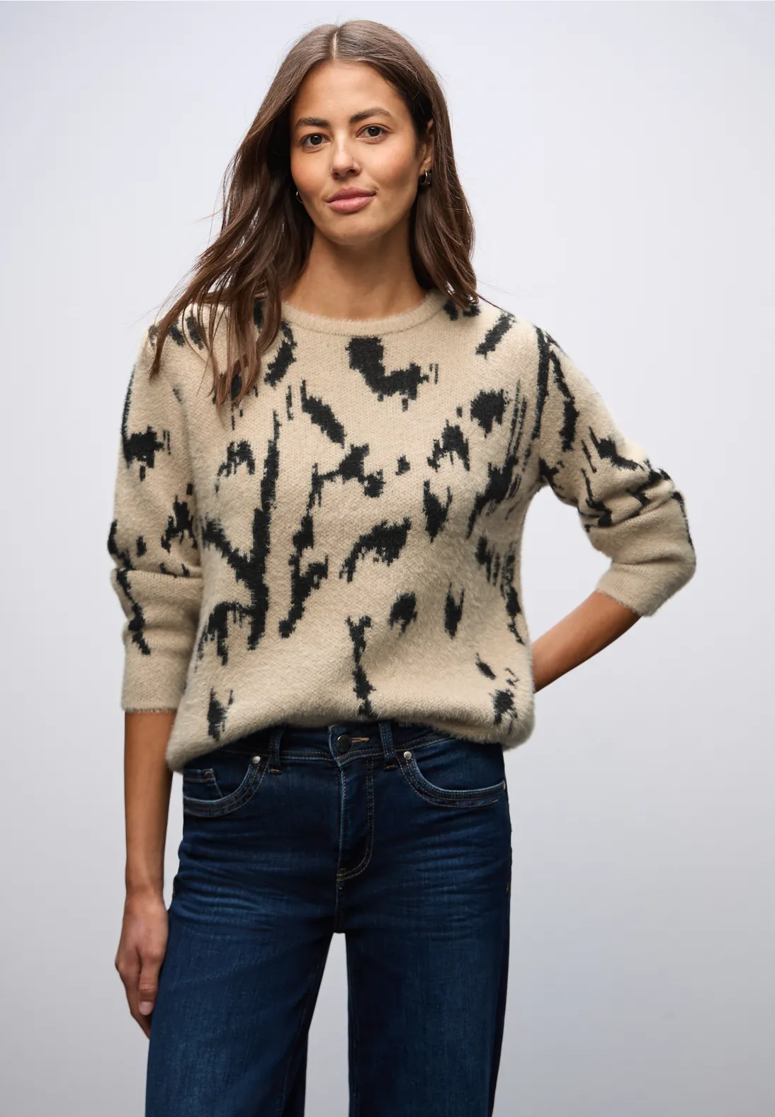 Experience ultimate comfort and style with this Street One women’s sweater in sanded beige. The soft feather yarn fabric feels luxuriously cozy, offering all-day comfort and a stylish appearance. The graphic jacquard pattern adds a modern, eye-catching touch to your wardrobe.
