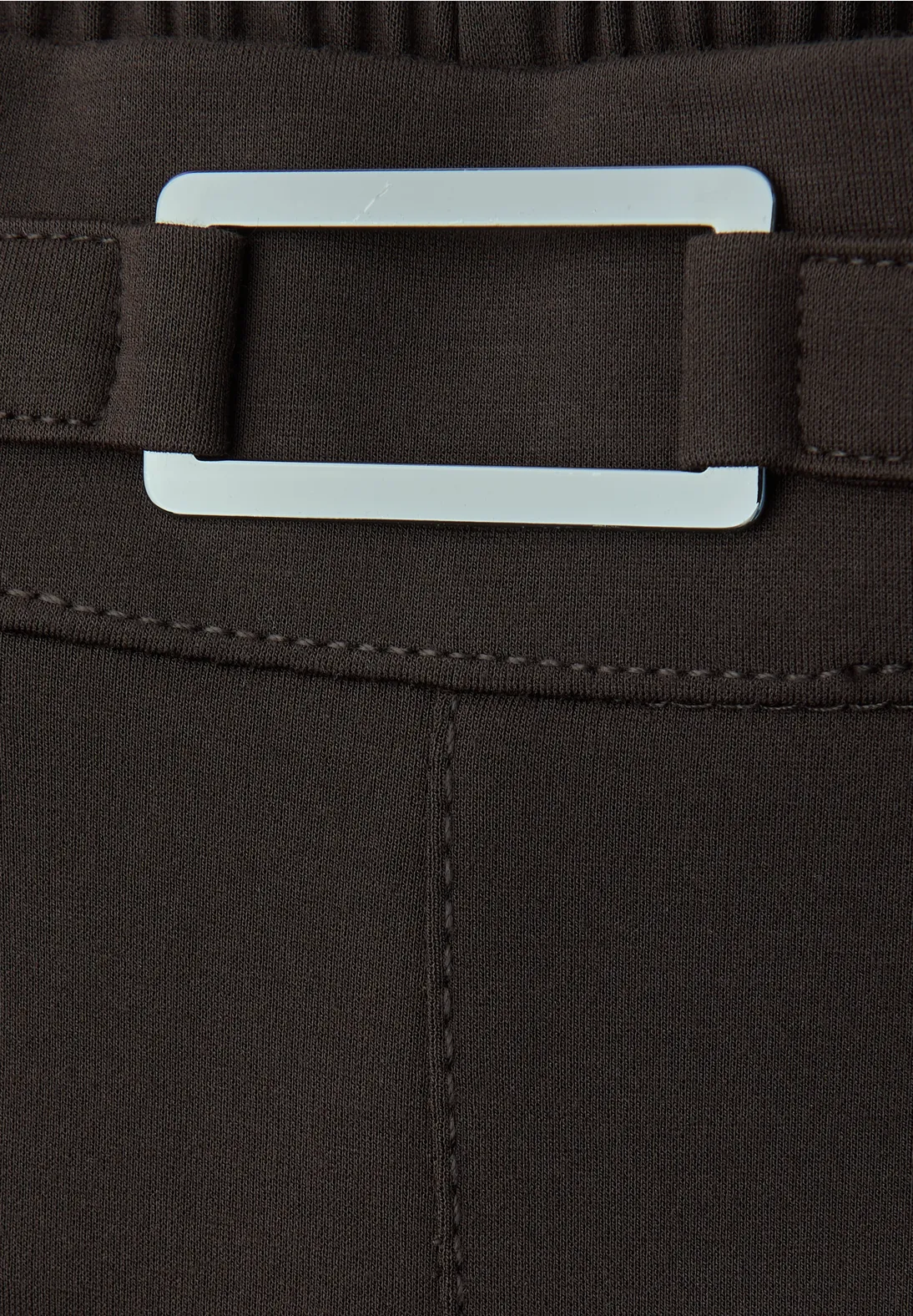 This elegant Street One women’s trouser in Darkest Brown combines a casual fit with straight legs and a high waist for a modern, flattering silhouette. The elastic waistband with buckle detail adds comfort and a stylish touch. Made from a soft viscose blend with stretch, these trousers feel smooth on the skin and allow for excellent freedom of movement. Perfect for both casual and chic looks.