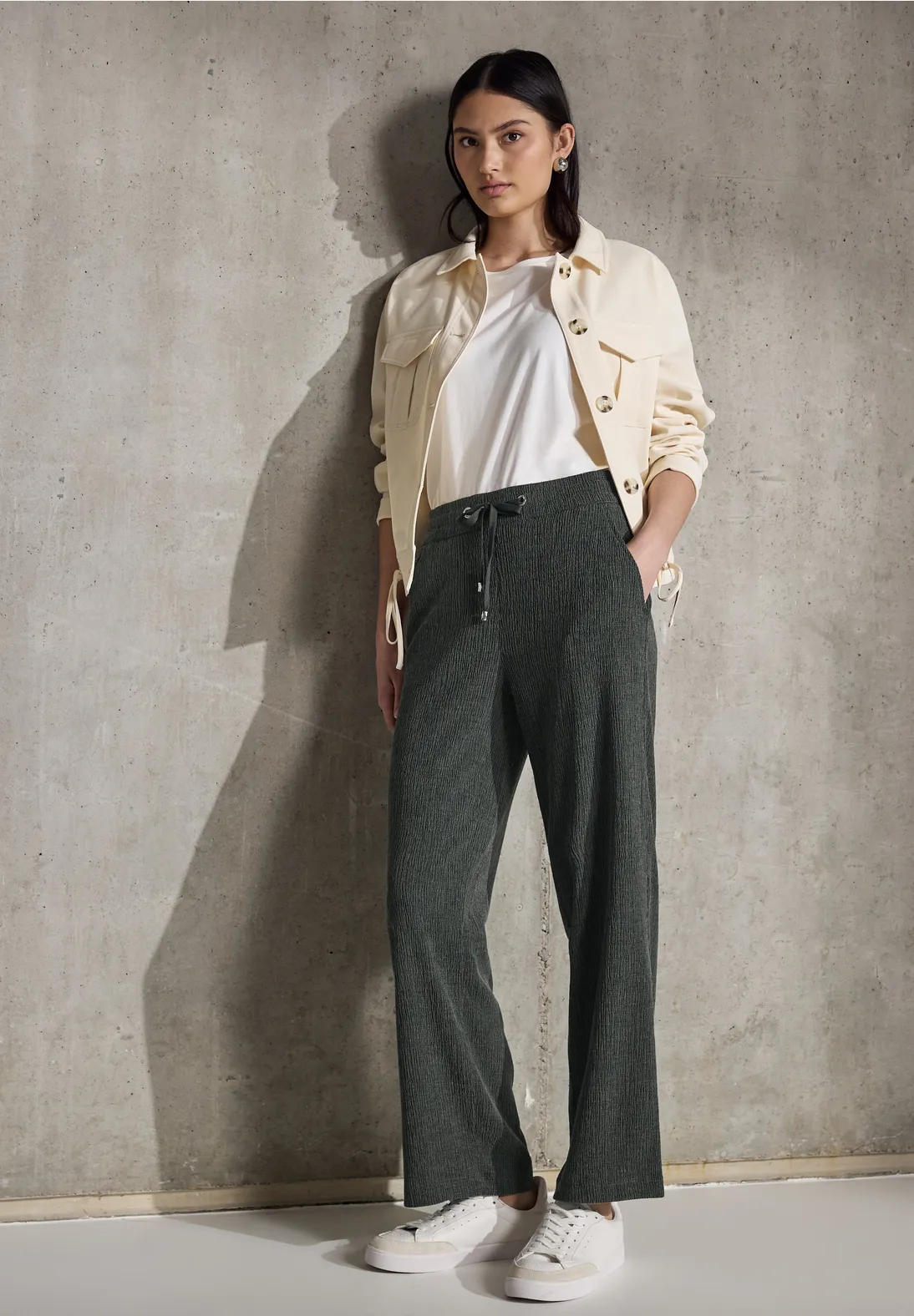 Street One Studio pants with a loose fit, high waist and straight legs. These Street One Studio pants have an elastic waistband with drawstring and a material mix with stretch and a subtle structure.