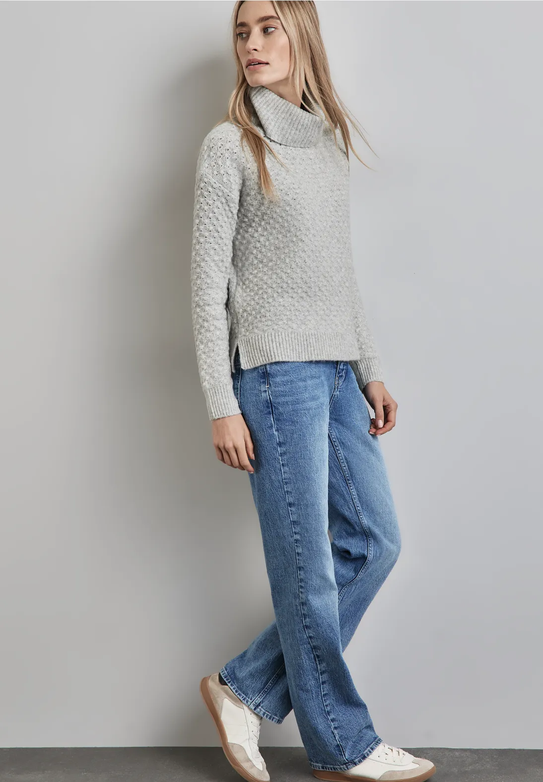 Structured Street One sweater with long sleeves, a turtleneck and a knitted pattern. This Street One sweater has side slits in the hem and is made of a soft material mix with comfortable stretch.