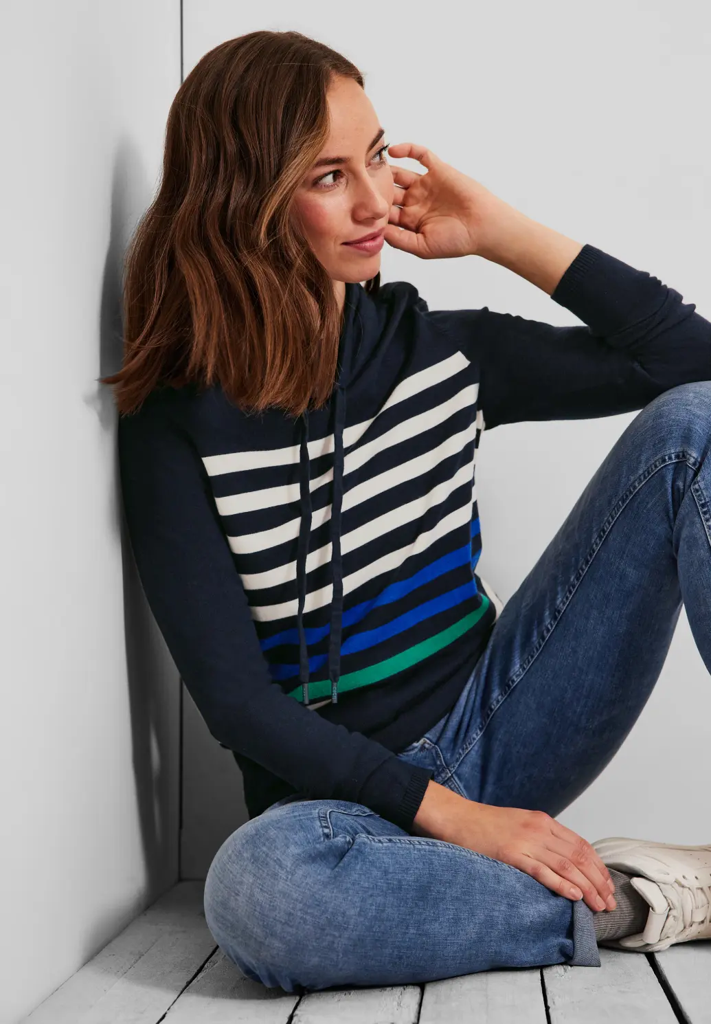 Cecil sweater with long sleeves, sporty stripes and a loose collar with drawstring.