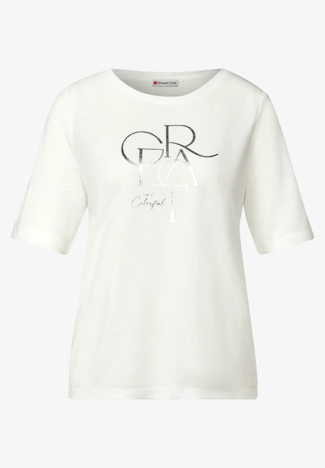 Lightweight Street One summer T-shirt with short sleeves, a round neckline and a glitter print.