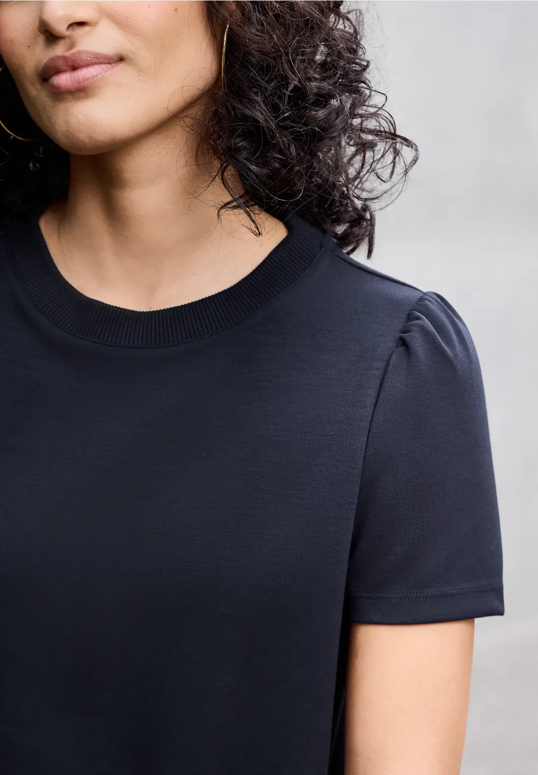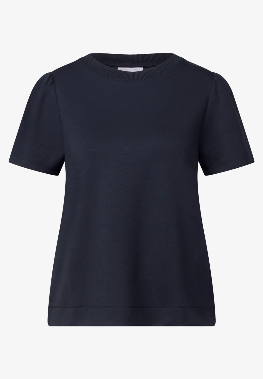 Street One Studio shirt with short puff sleeves and a round neckline. The solid color makes this Street One Studio shirt a versatile essential. Made from a material mix with stretch.