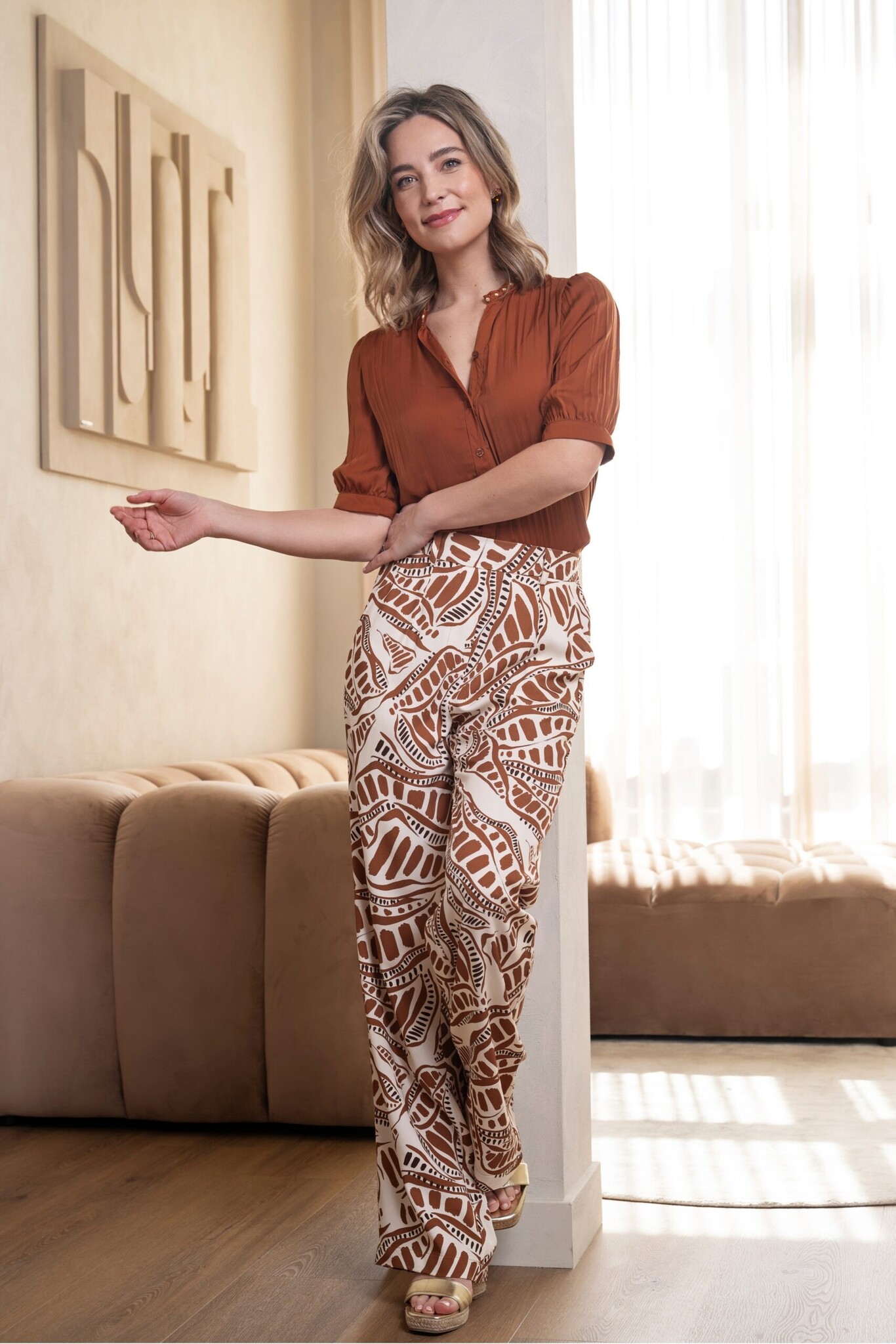 Elvira Collections Cacao. Elvira Collections pants with a casual fit, wide legs and an elastic waistband in the back.