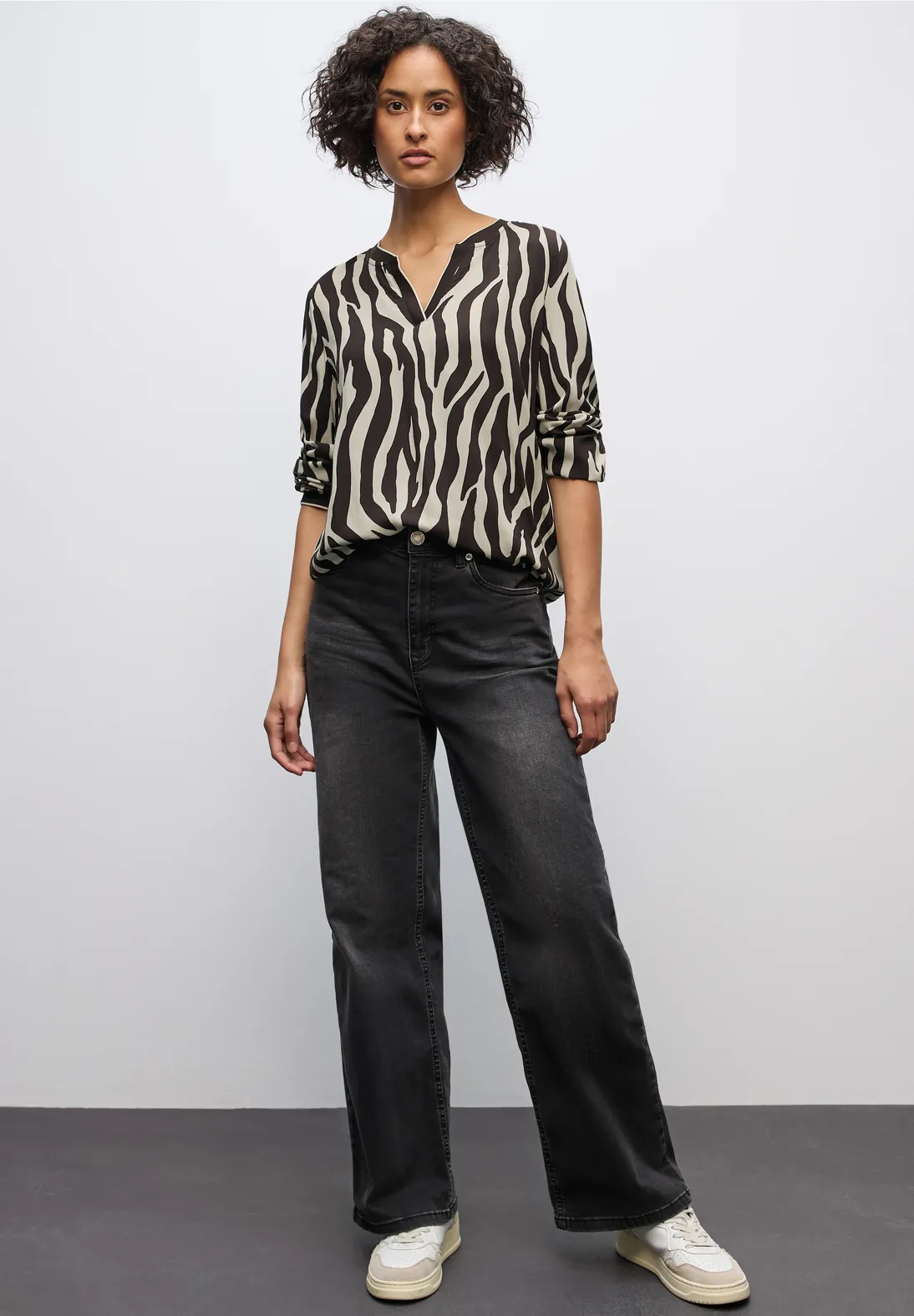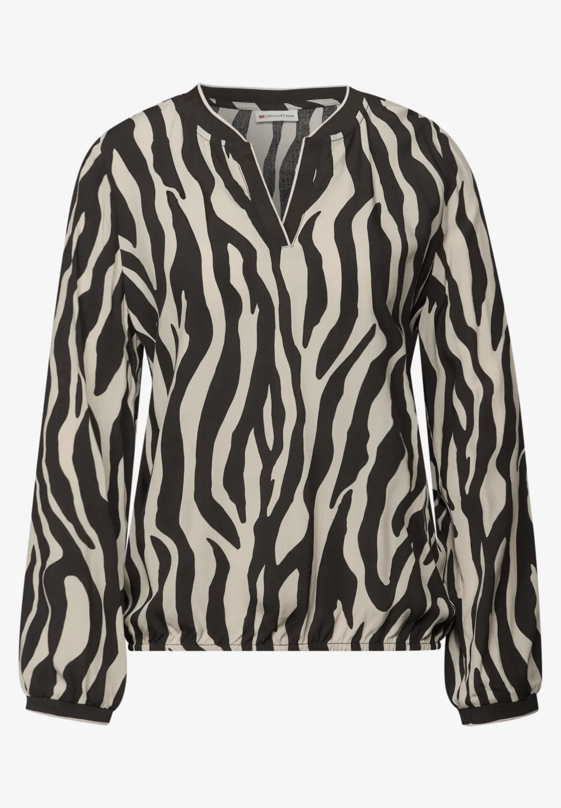 Street One tunic blouse with long sleeves, a round neck with a V-slit and sporty tape details. This Street One blouse has an elastic hem for a relaxed fit. Made of soft viscose.