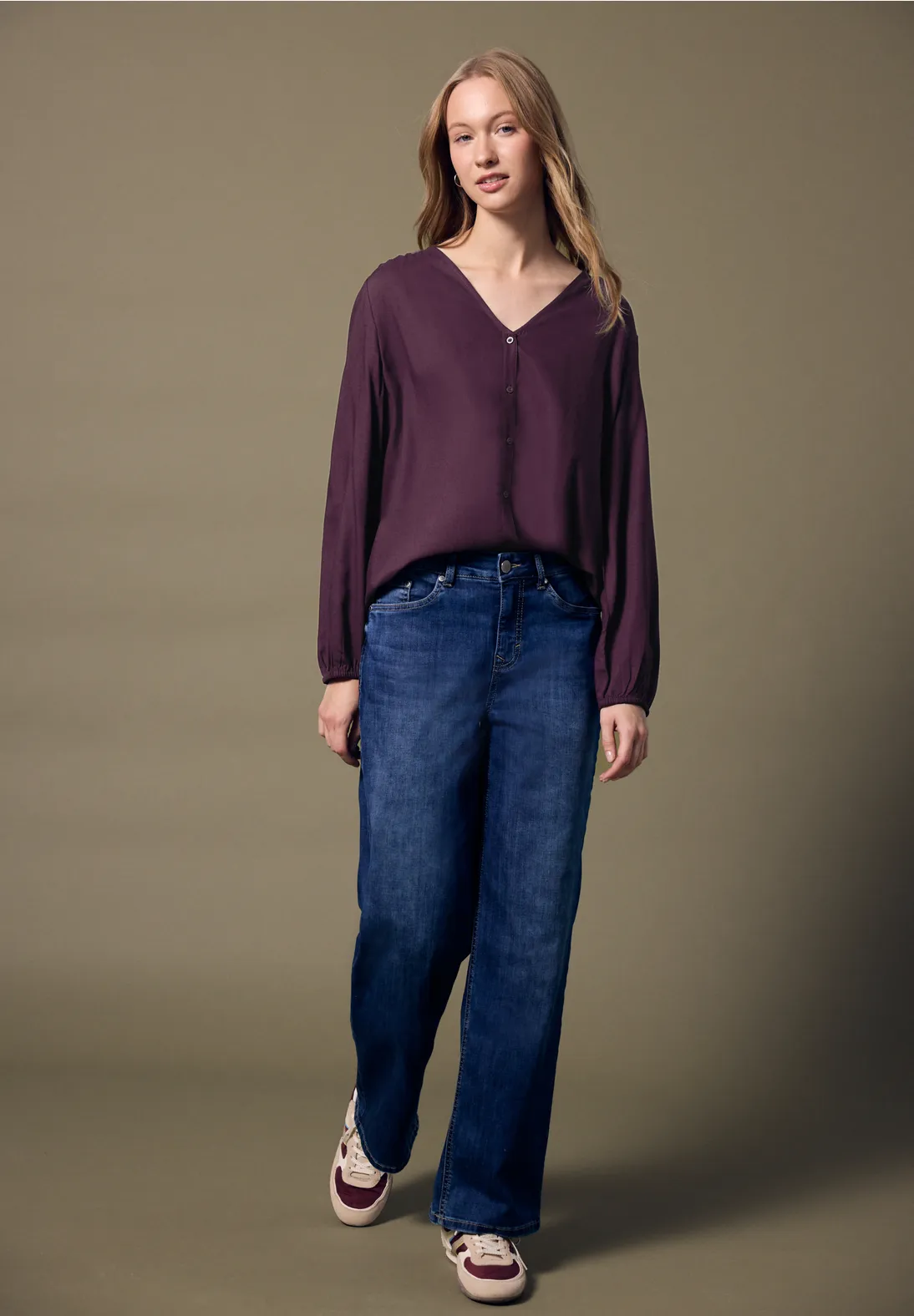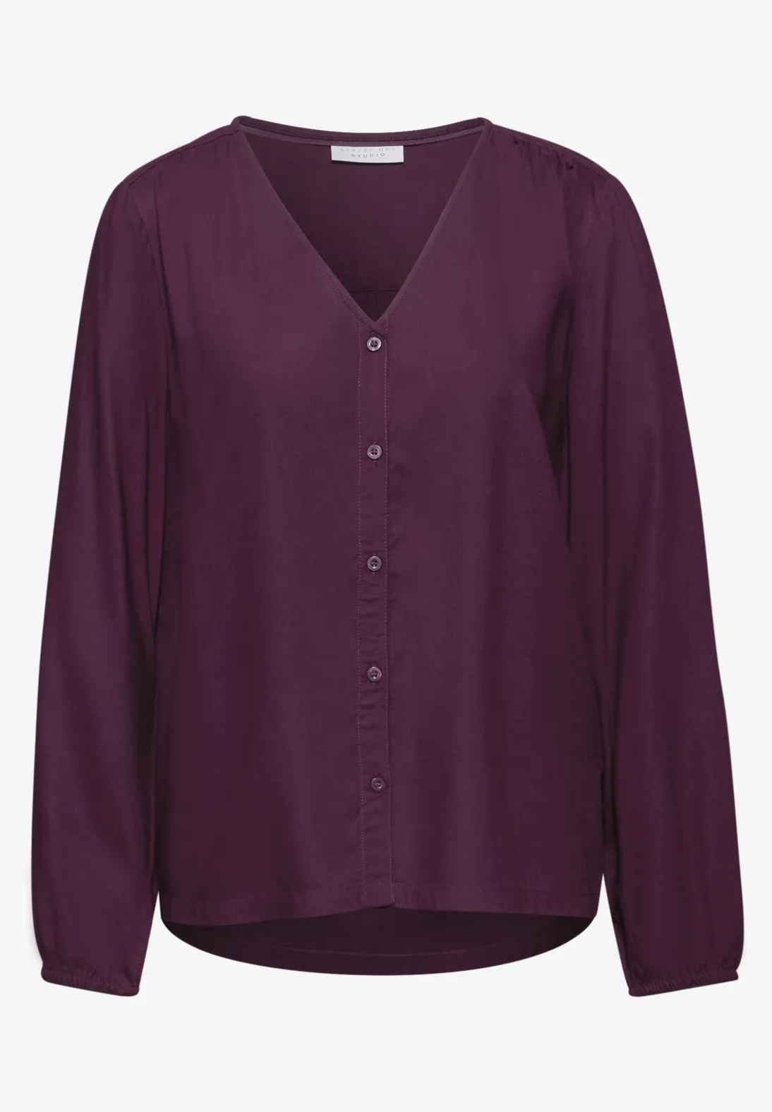 This purple women’s blouse from Street One Studio blends elegant style with all-day comfort. Made from 100% soft viscose, the blouse comes in a chic Royal Plum shade. Featuring a flattering V-neckline, delicate button placket and long sleeves with elastic cuffs, this viscose blouse is perfect for both office wear and casual looks. Pair this elegant women's top effortlessly with trousers or skirts for a polished outfit – day or night.