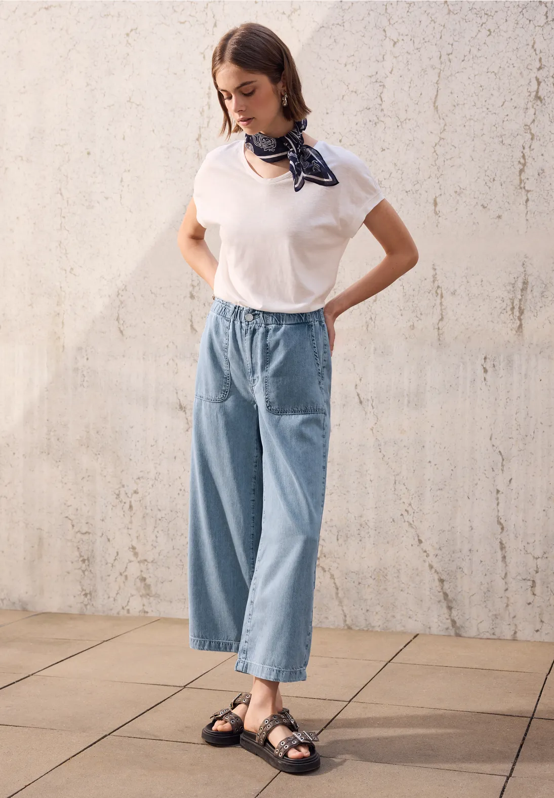 Street One Studio paperbag jeans with a loose fit, high waist and wide legs in a summer length. These Street One Studio pants have a light blue wash and side pockets. Made of a pleasant cotton mix for the summer.