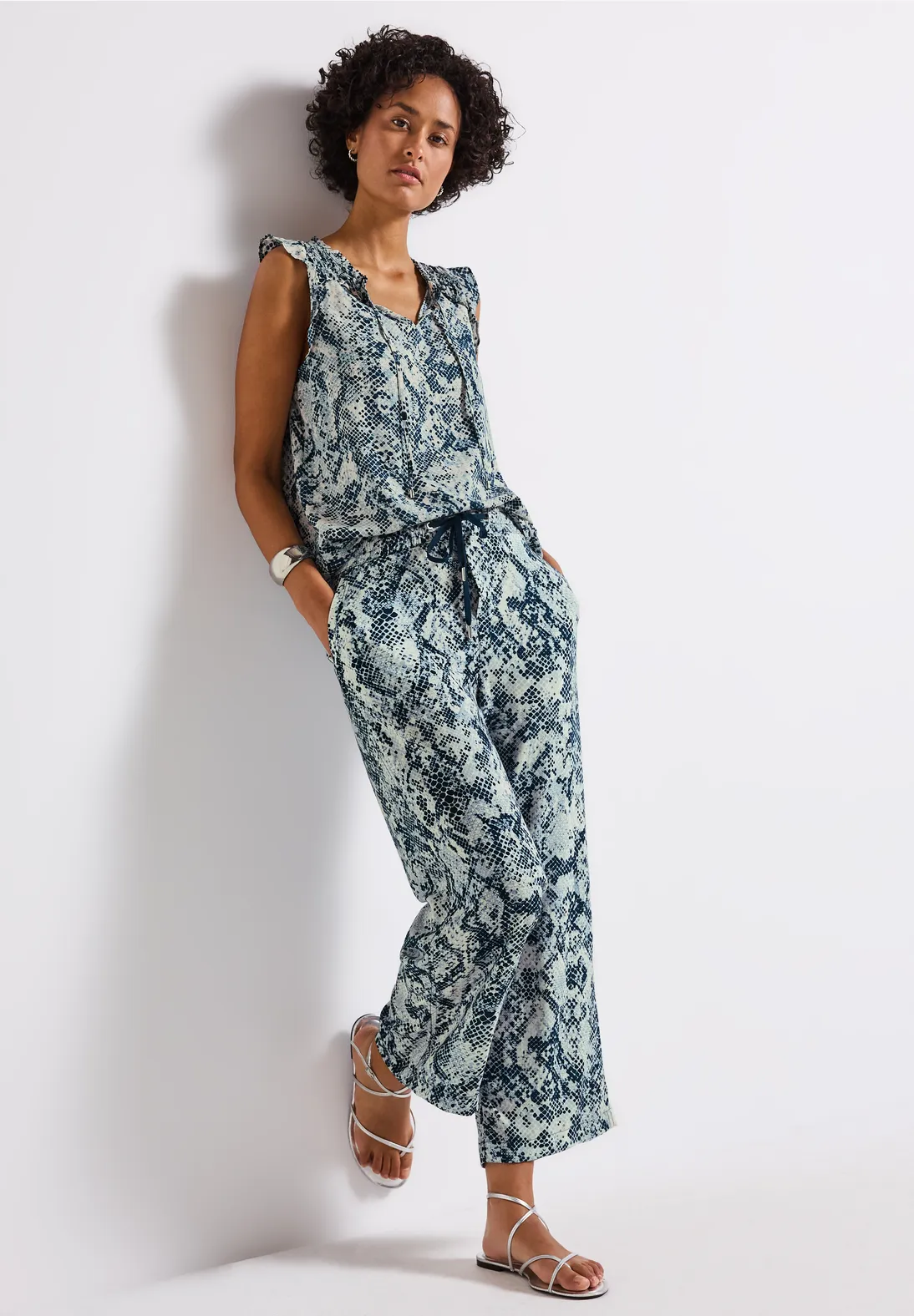 Street One Emee. Street One pants with a loose fit, a high elastic waistband and wide legs in a summer length. These Street One pants have side pockets and an allover print. Made from light viscose.