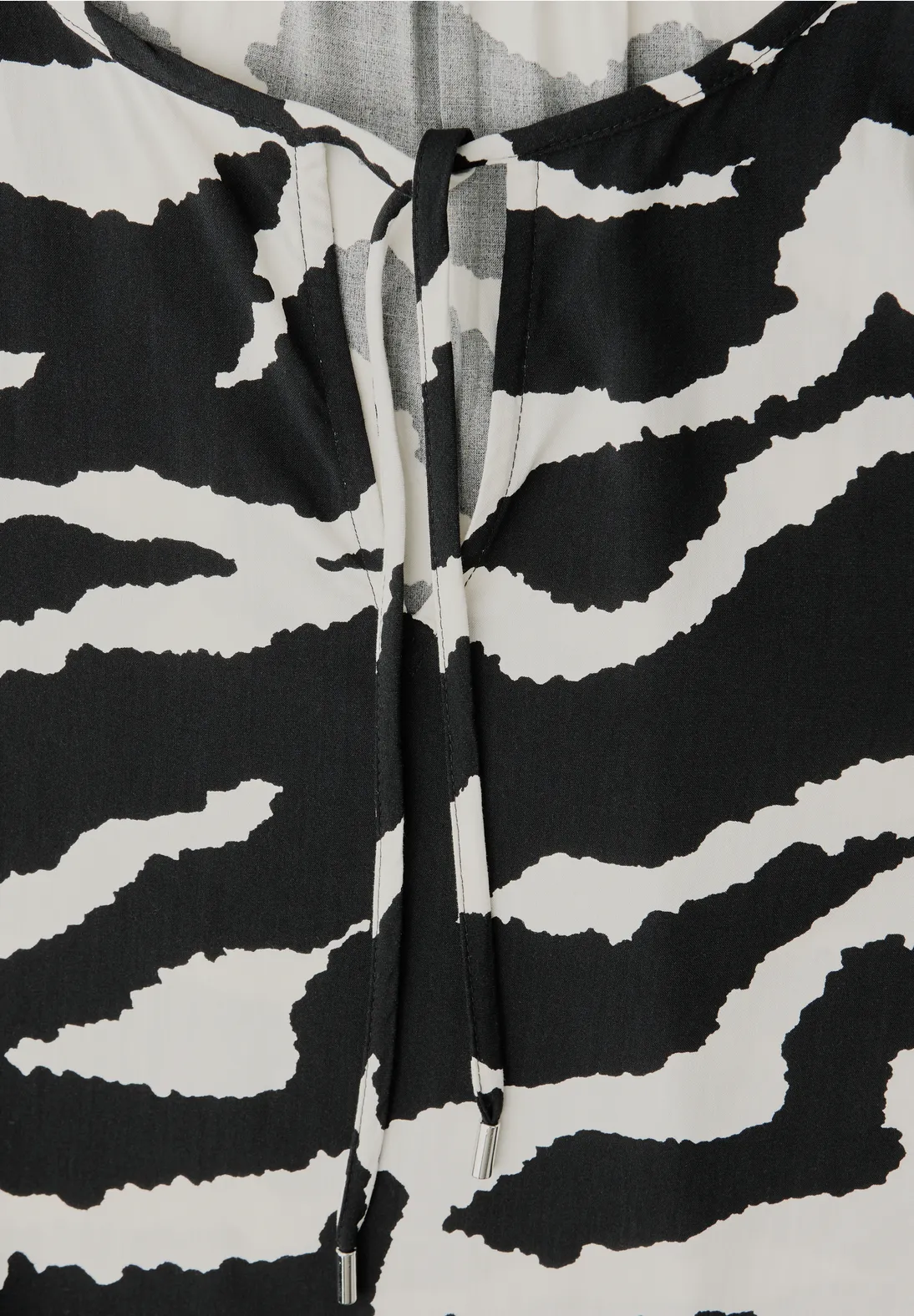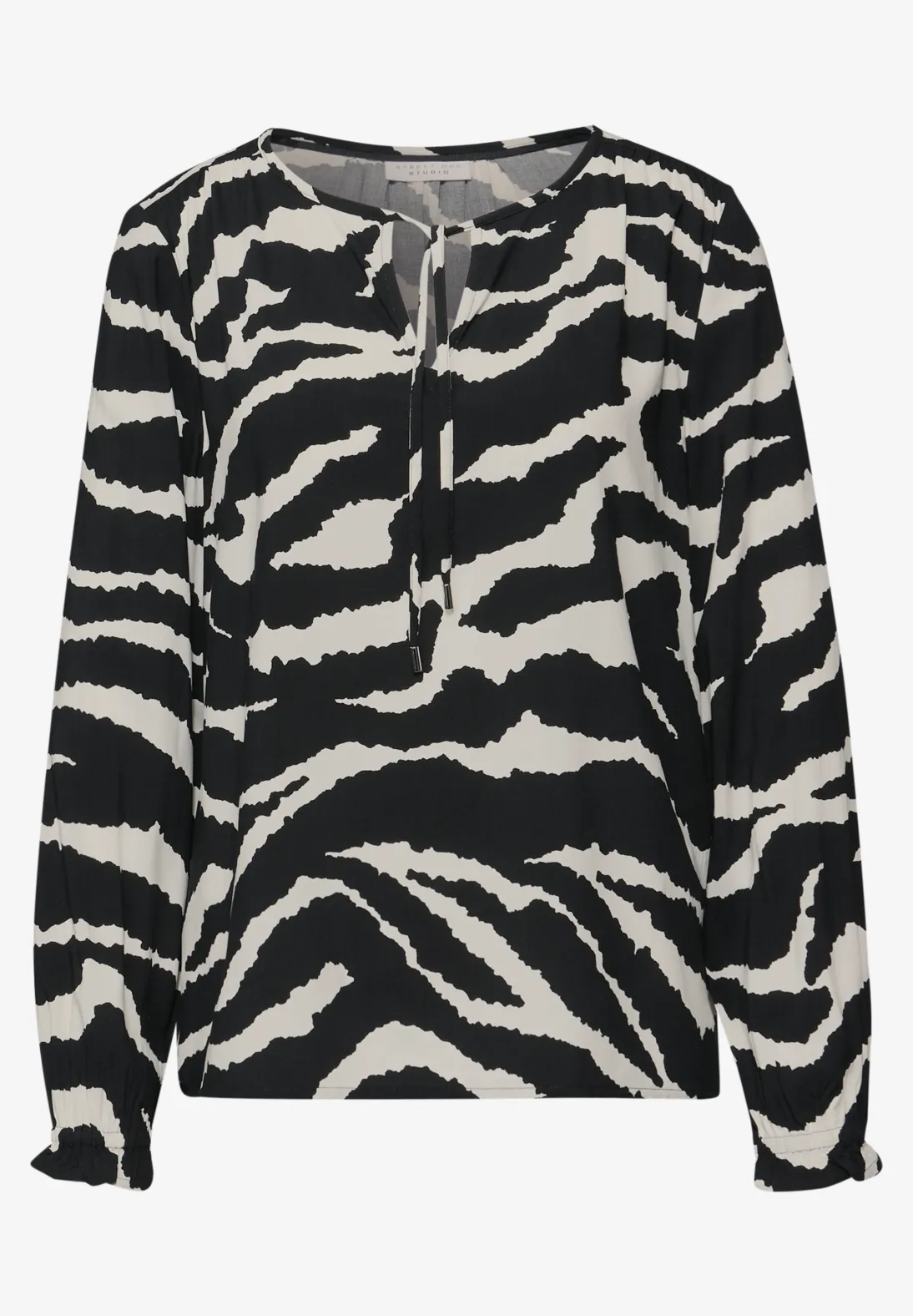 Discover the trendy tunic from Street One Studio in the stylish shade Flint Grey. The modern zebra print adds a fashionable touch, while the flowing viscose fabric ensures a soft, comfortable feel. The split neckline with delicate ties and subtle ruffles on the sleeves highlight your feminine charm. Easy to style with jeans or elegant trousers for any occasion.