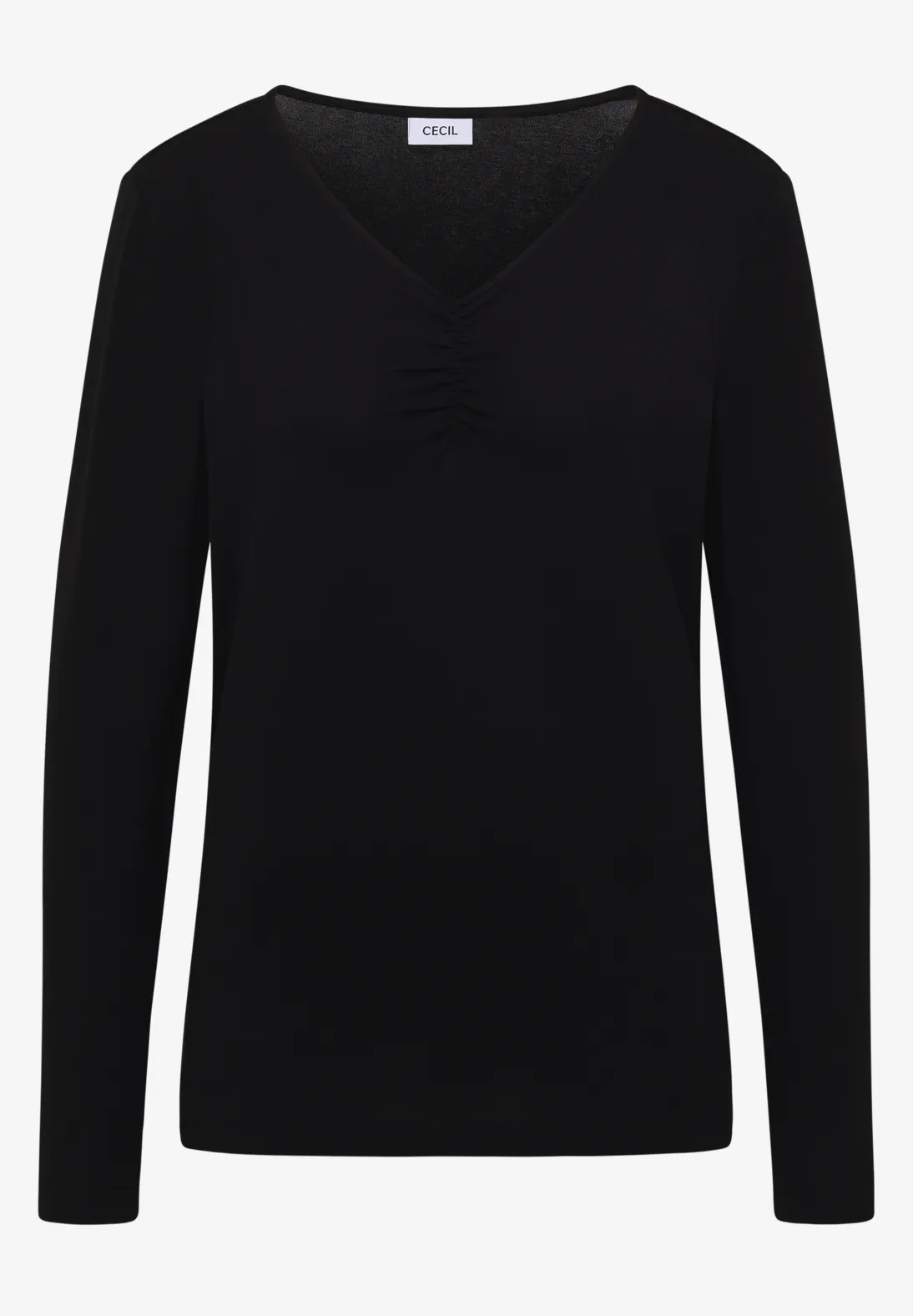 Dit zwarte dames shirt van CECIL combineert eenvoud met een vrouwelijke touch. De elegante plooien bij de V-halslijn zorgen voor een subtiel accent, terwijl de effen kleur en lange mouwen het shirt tot een veelzijdig item maken. Gemaakt van een zachte katoen-modal mix met stretch voor optimaal draagcomfort. Perfect voor elke dag, van casual tot chic.