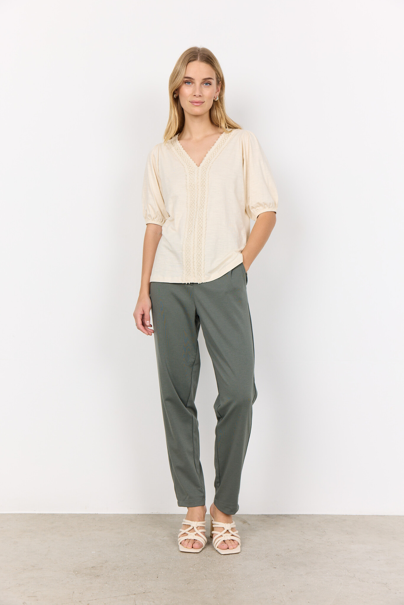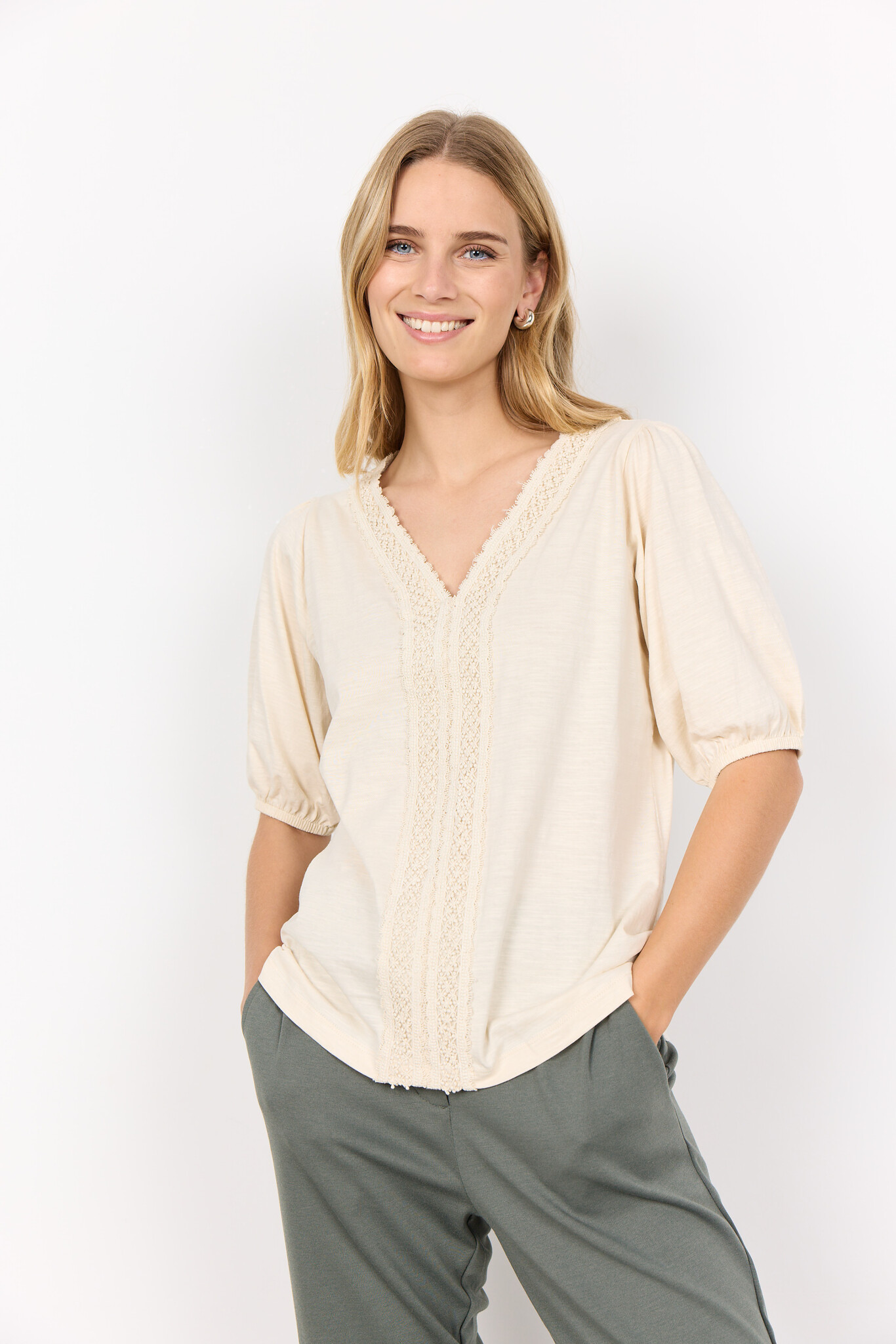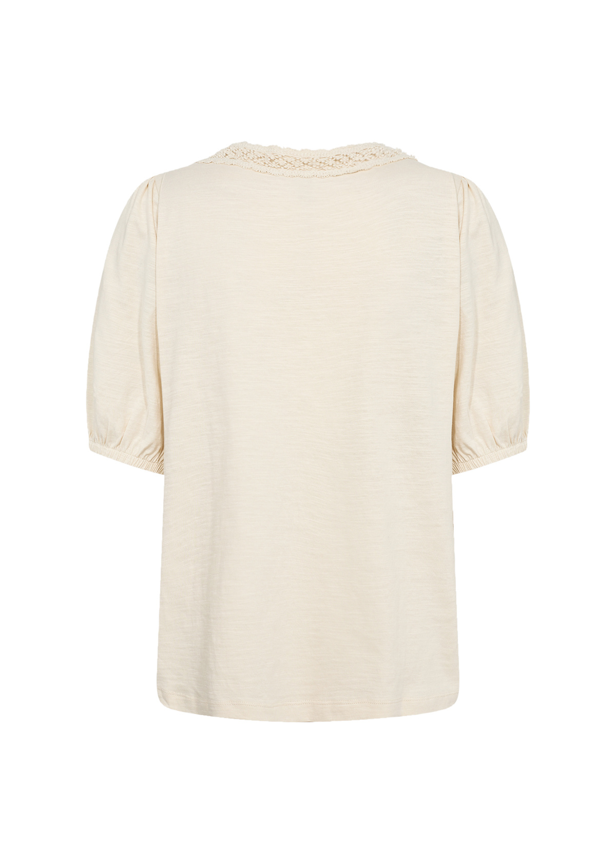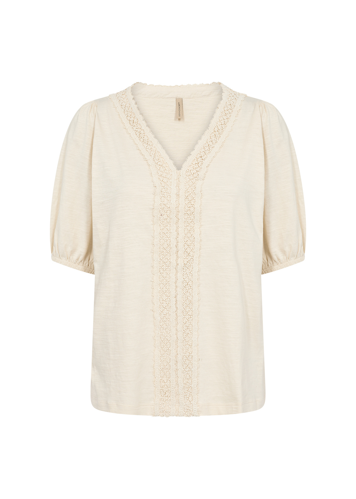 Soyaconcept SC-BABETTE 67. Soyaconcept blouse met een V-hals, kanten bies en korte mouwen met elastiek. Deze Soyaconcept blouse is gemaakt van biologisch katoen.