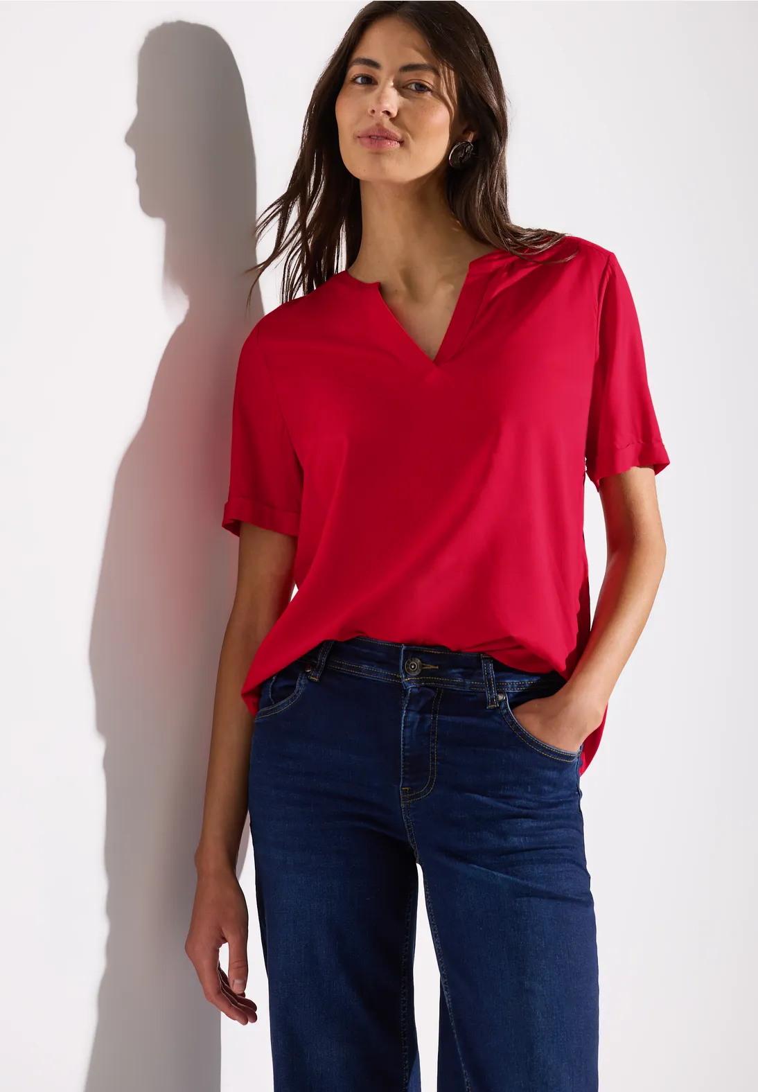 Effen Street One blouse met korte mouwen en een ronde hals met split. Deze Street One blouse is gemakkelijk te combineren en gemaakt van zachte viscose.