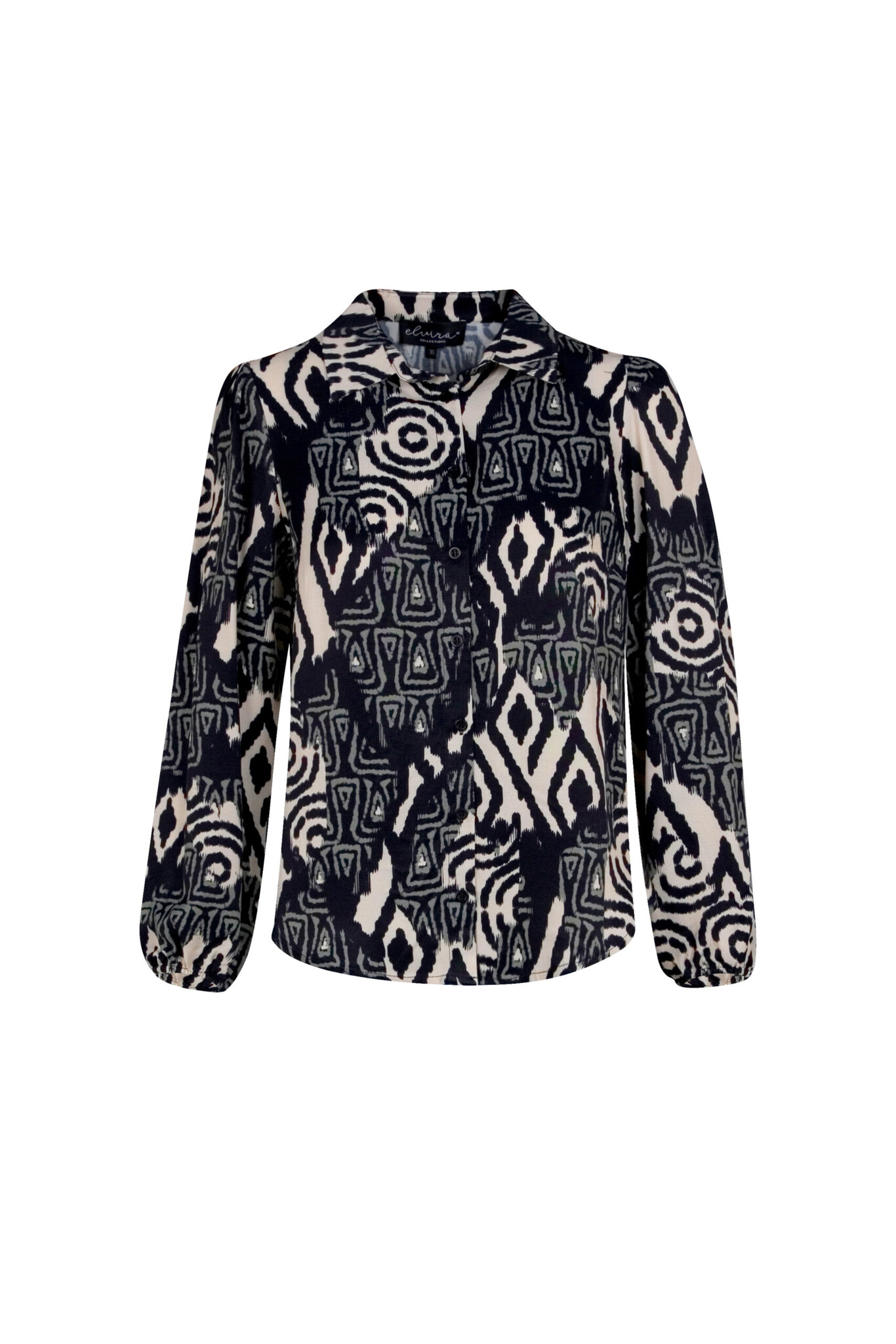 Elvira Collections June. Elvira Collections blouse met lange mouwen, een kraag en een allover print. Deze Elvira blouse heeft een doorlopende knoopsluiting en elastische manchetten.