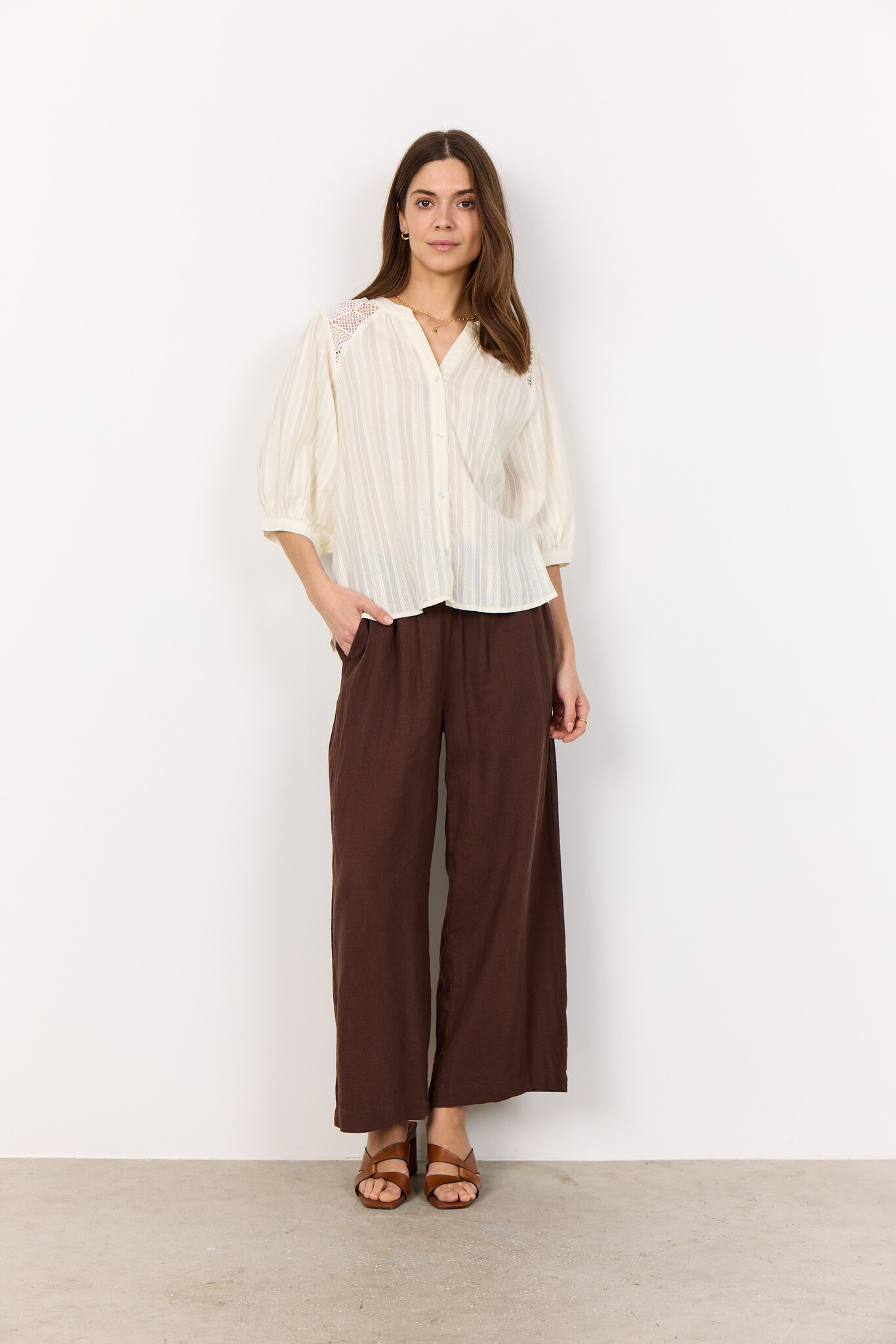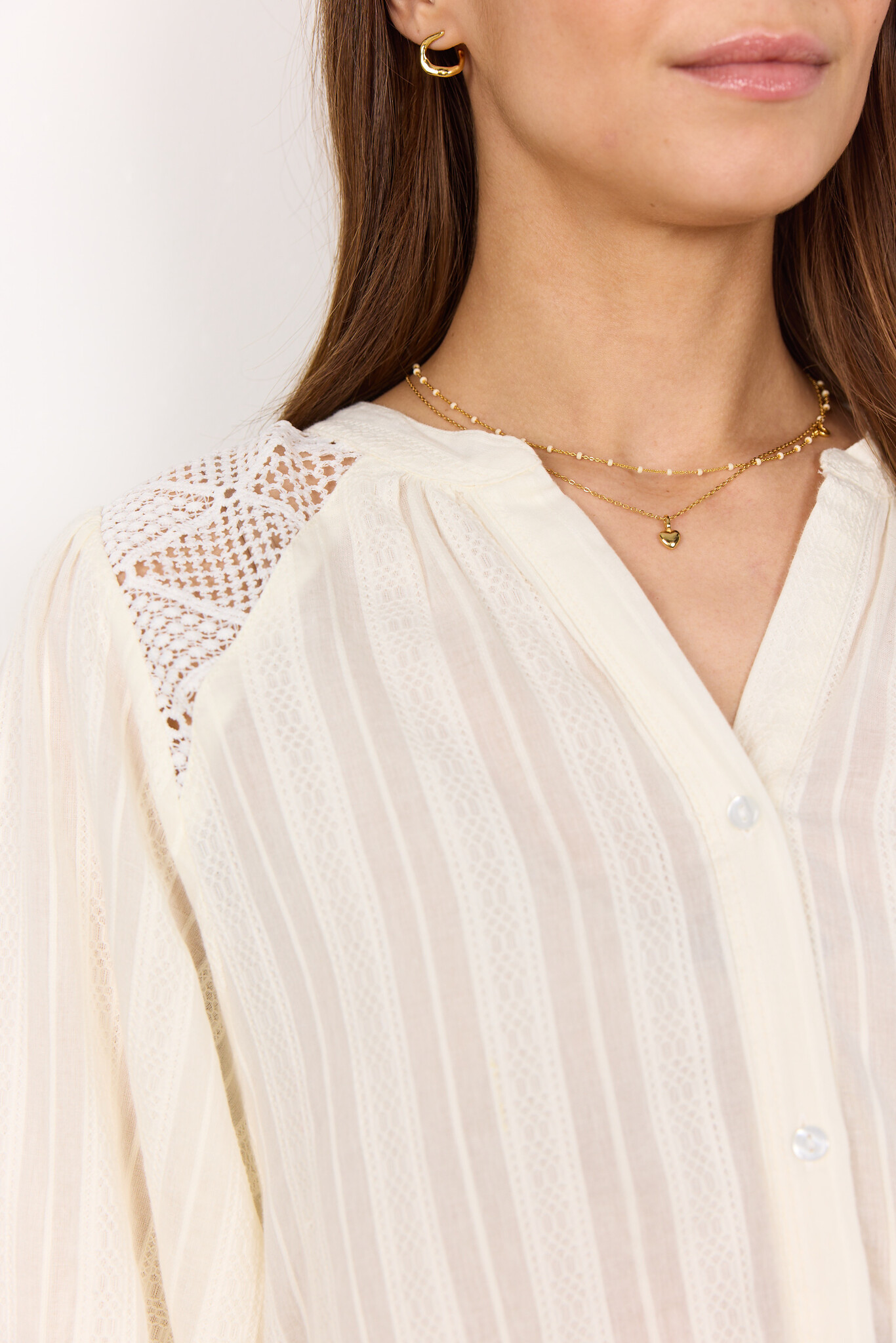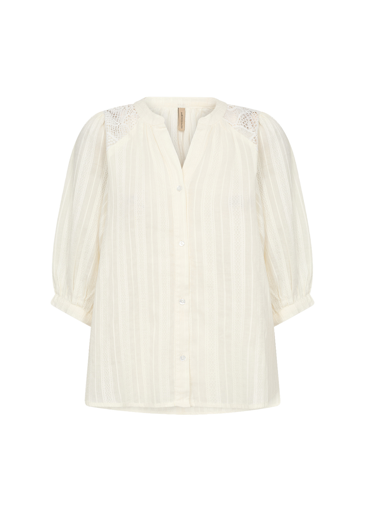 Soyaconcept SC-RAFAELLA 3. Soyaconcept blouse met 3/4-mouwen, een V-hals met doorlopende knoopsluiting en kanten details op de schouders. Deze Soyaconcept blouse heeft een relaxed fit en is gemaakt van biologisch katoen.