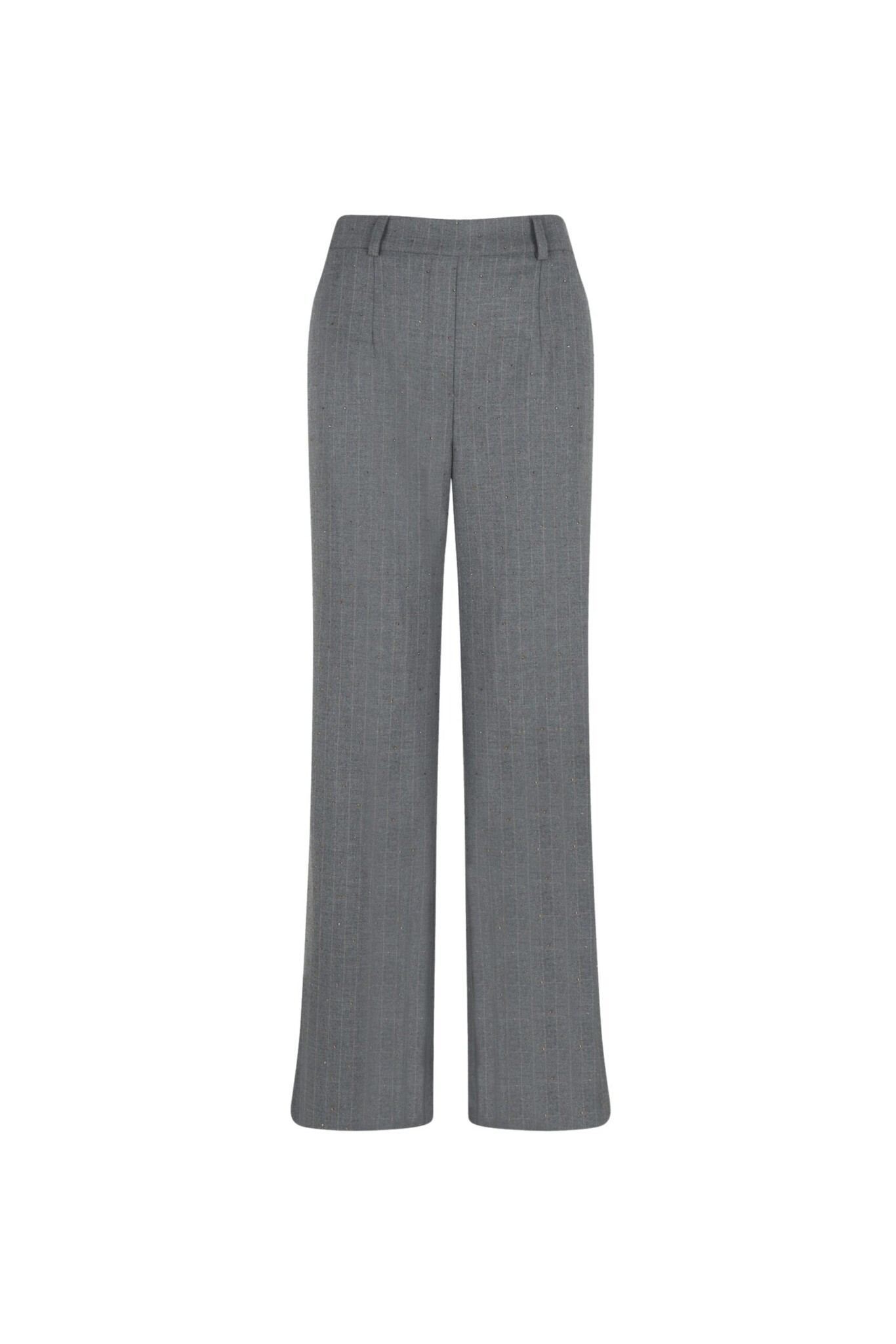 De Elvira Collections Broek Maxime in de kleur Grey Bronzed combineert elegantie met draagcomfort. Deze stijlvolle broek heeft wijde pijpen, steekzakken en een elastiek aan de achterkant van de tailleband voor een perfecte pasvorm. De subtiele bronzen krijtstreep en de glinsterende steentjes geven de broek een chique en verfijnde uitstraling. Perfect te dragen op zichzelf of te combineren met Blazer Maxime voor een complete, modieuze look.