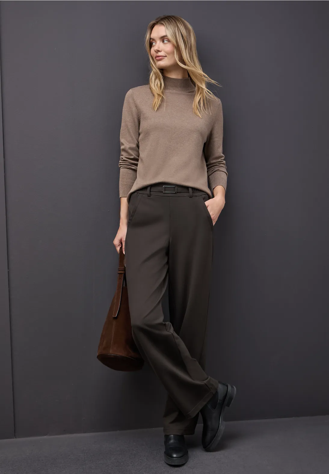 Deze stijlvolle Street One damesbroek in de kleur Darkest Brown combineert een casual pasvorm met rechte pijpen en een hoge taille voor een moderne, flatterende look. De elastische tailleband met gespdetail zorgt voor extra comfort én een trendy accent. Dankzij de zachte viscosemix met stretch voelt de stof aangenaam aan op de huid en biedt de broek optimale bewegingsvrijheid. Perfect te stylen voor zowel een casual als een elegante outfit.