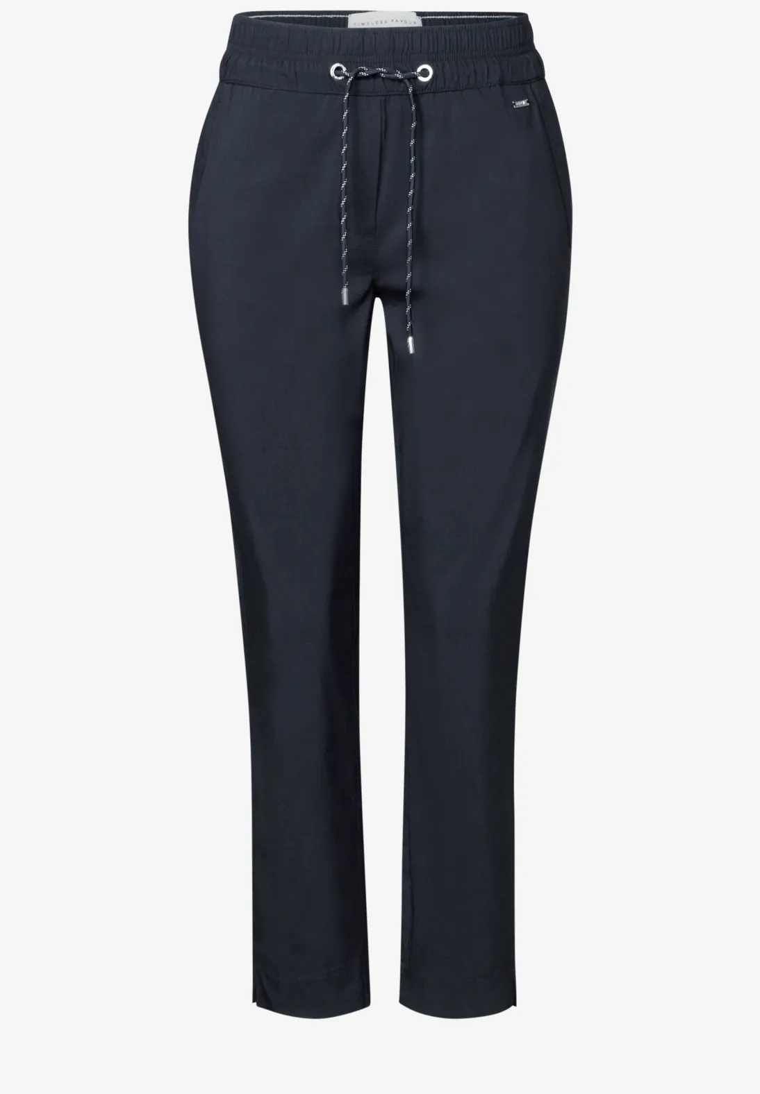 Cecil Tracey. Cecil broek met een casual fit, een elastische tailleband met trekkoord en smalle broekspijpen in een zomerse lengte. Deze Cecil broek heeft steekzakken en is gemaakt van een katoenmix met comfortabele stretch.