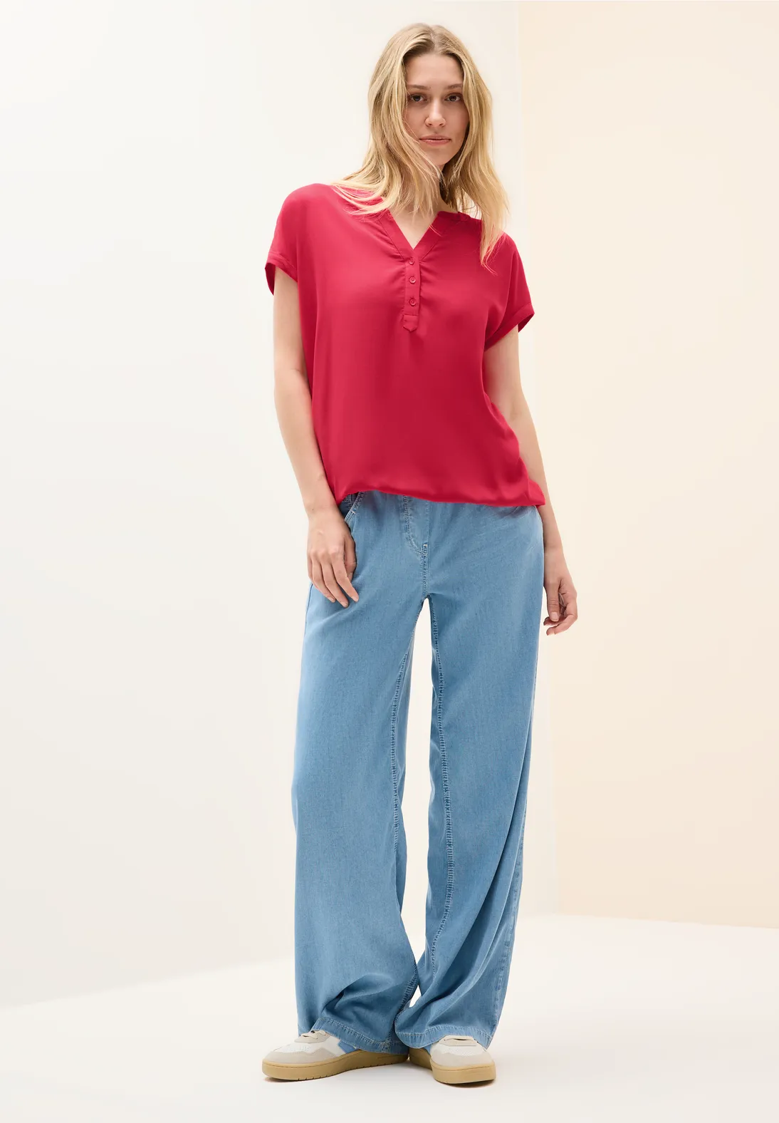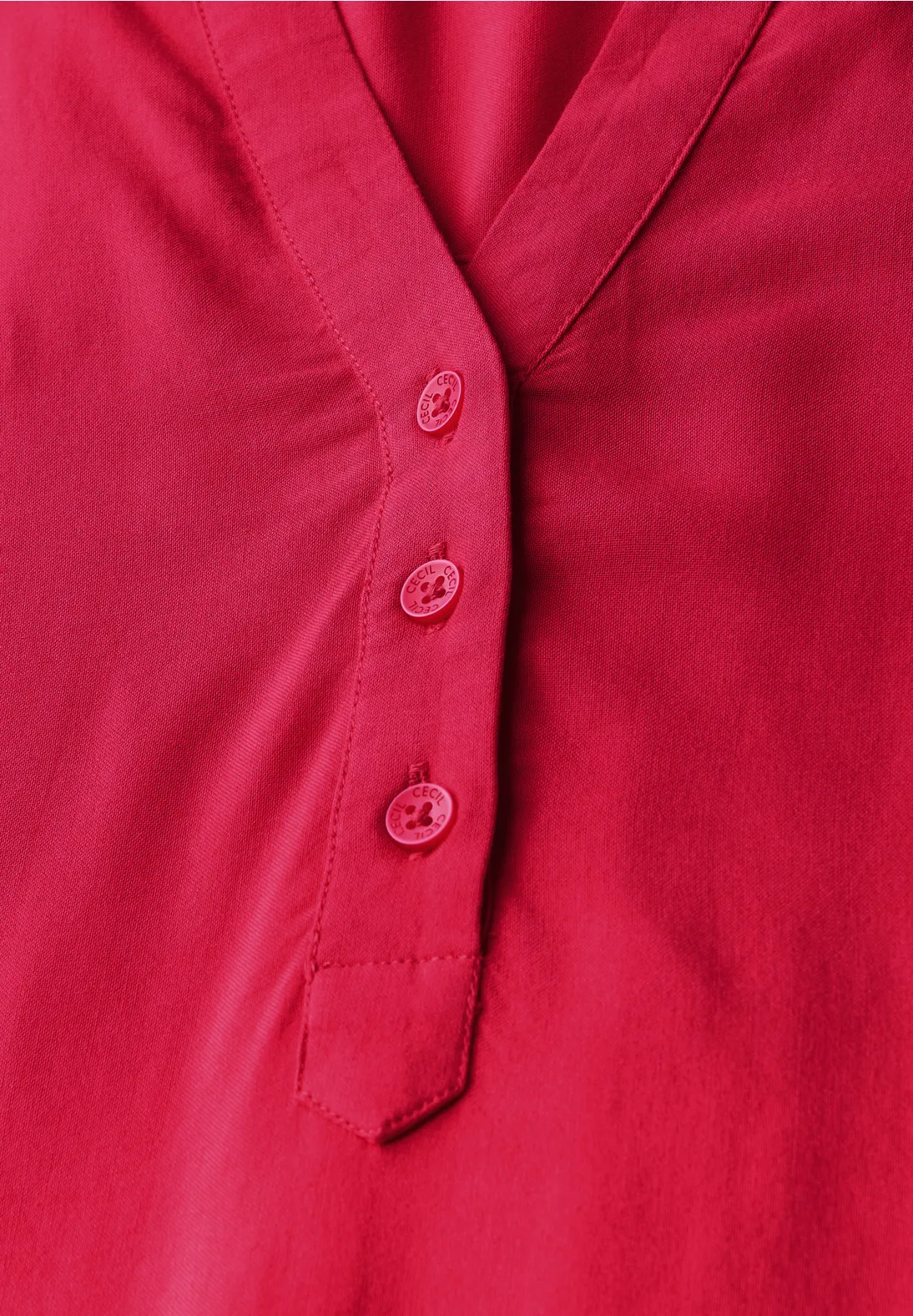 Basic Cecil blouse met korte mouwen en een hals met split en decoratieve knoopsluiting. Deze Cecil blouse heeft een elastische zoom en is gemaakt van zachte viscose.
