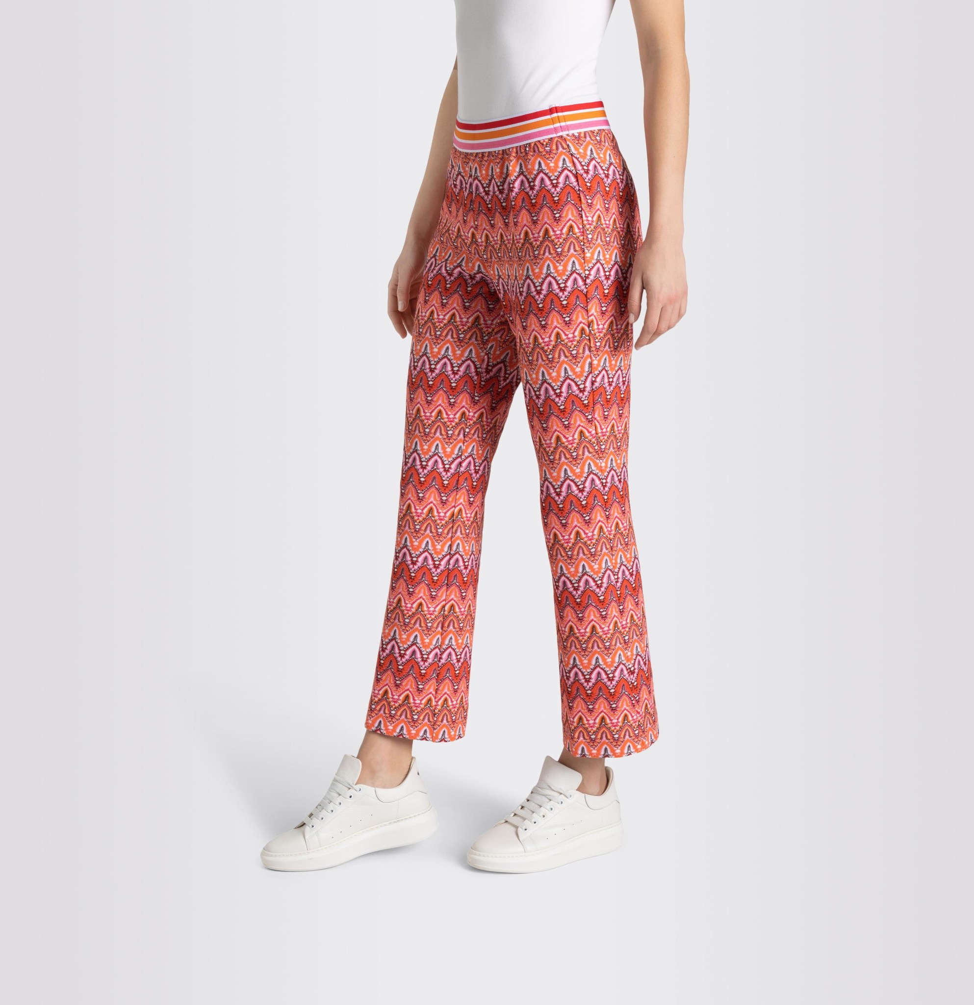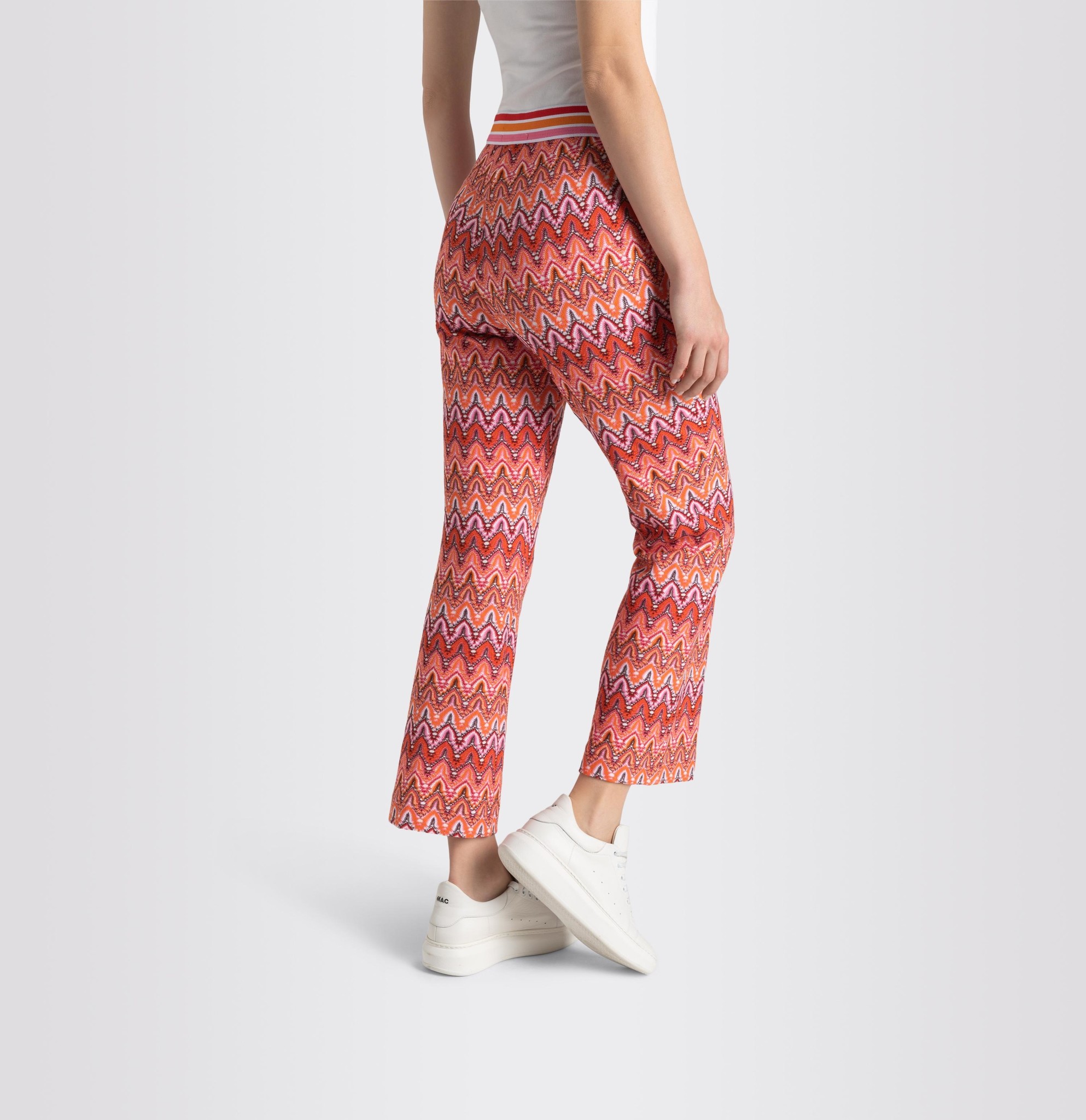 Mac Jeans Flare. Comfortabele Mac broek met een slim fit, een elastische tailleband en uitlopende broekspijpen in een kick lengte. Deze Mac broek is gemaakt van compact materiaal met een jacquard patroon met een kanten look.