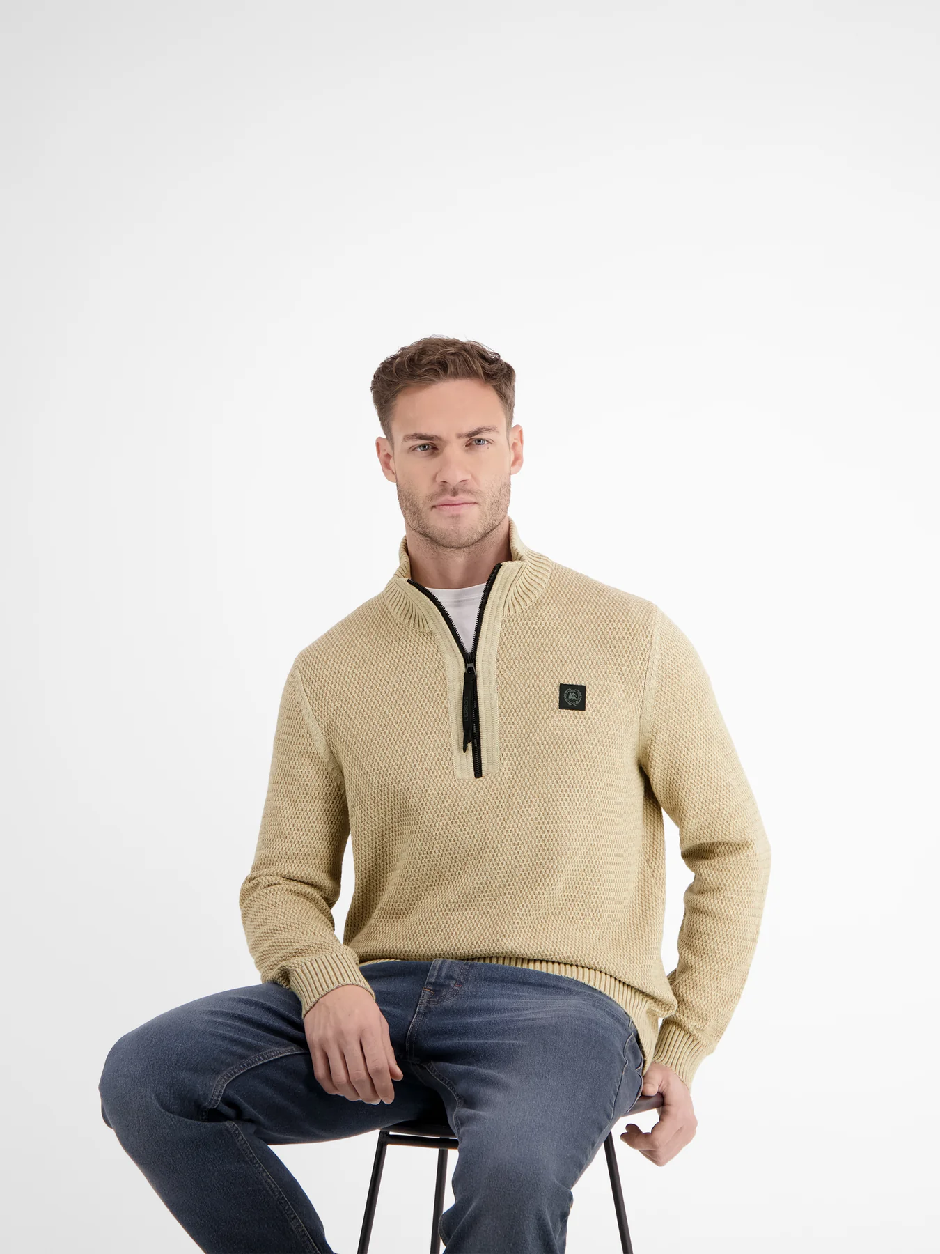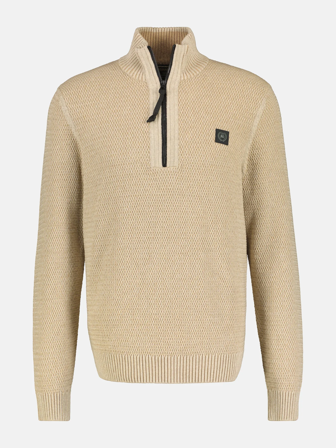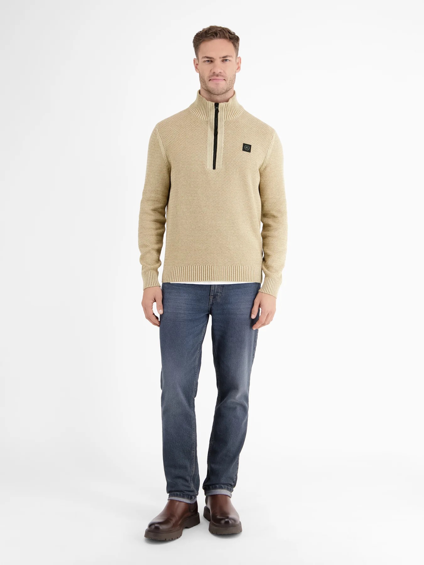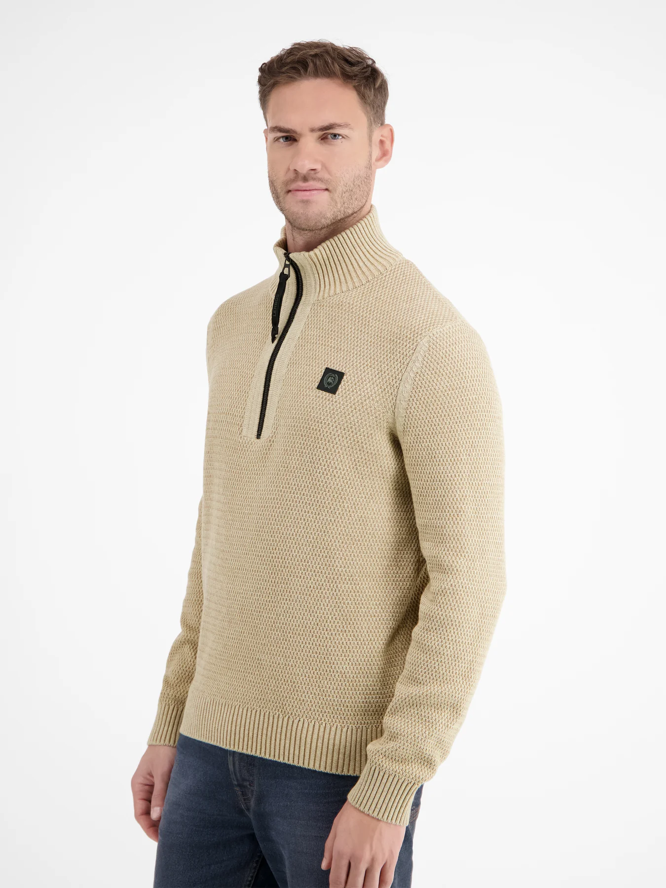Gebreide Lerros trui met lange mouwen en een staande kraag met een ritssluiting. Deze Lerros trui heeft een modern fit en is gemaakt van BCI-Katoen. De sportieve ribboorden maken deze Lerros trui compleet.