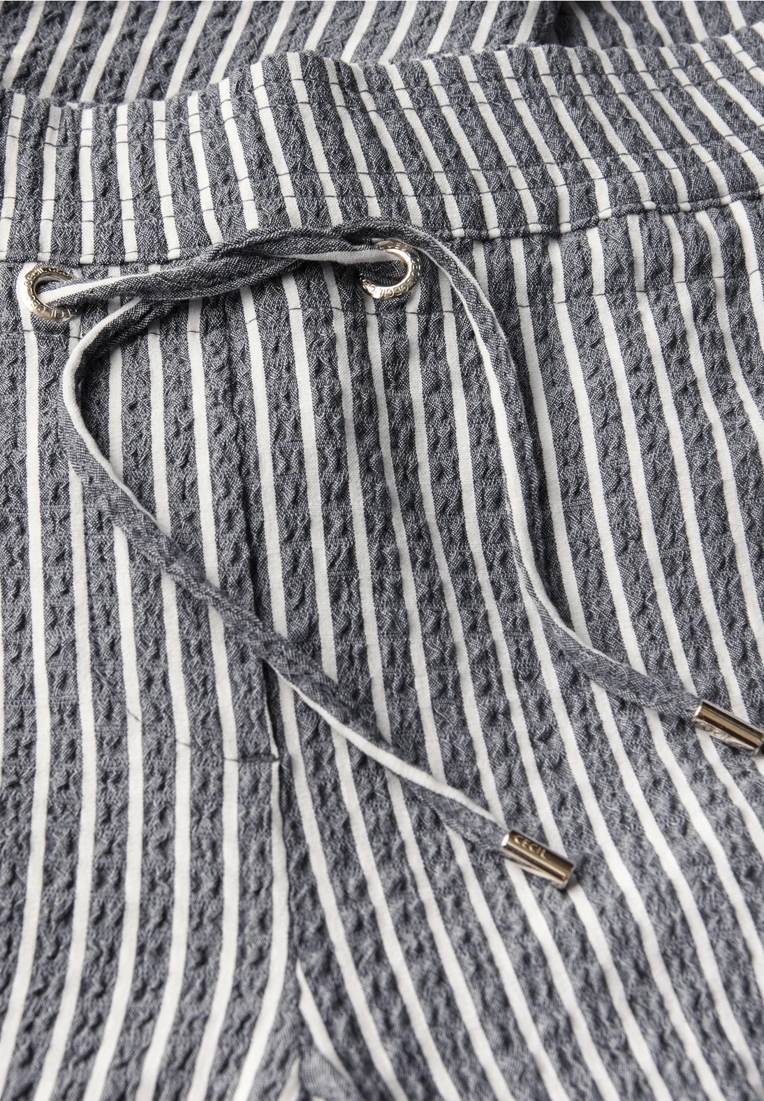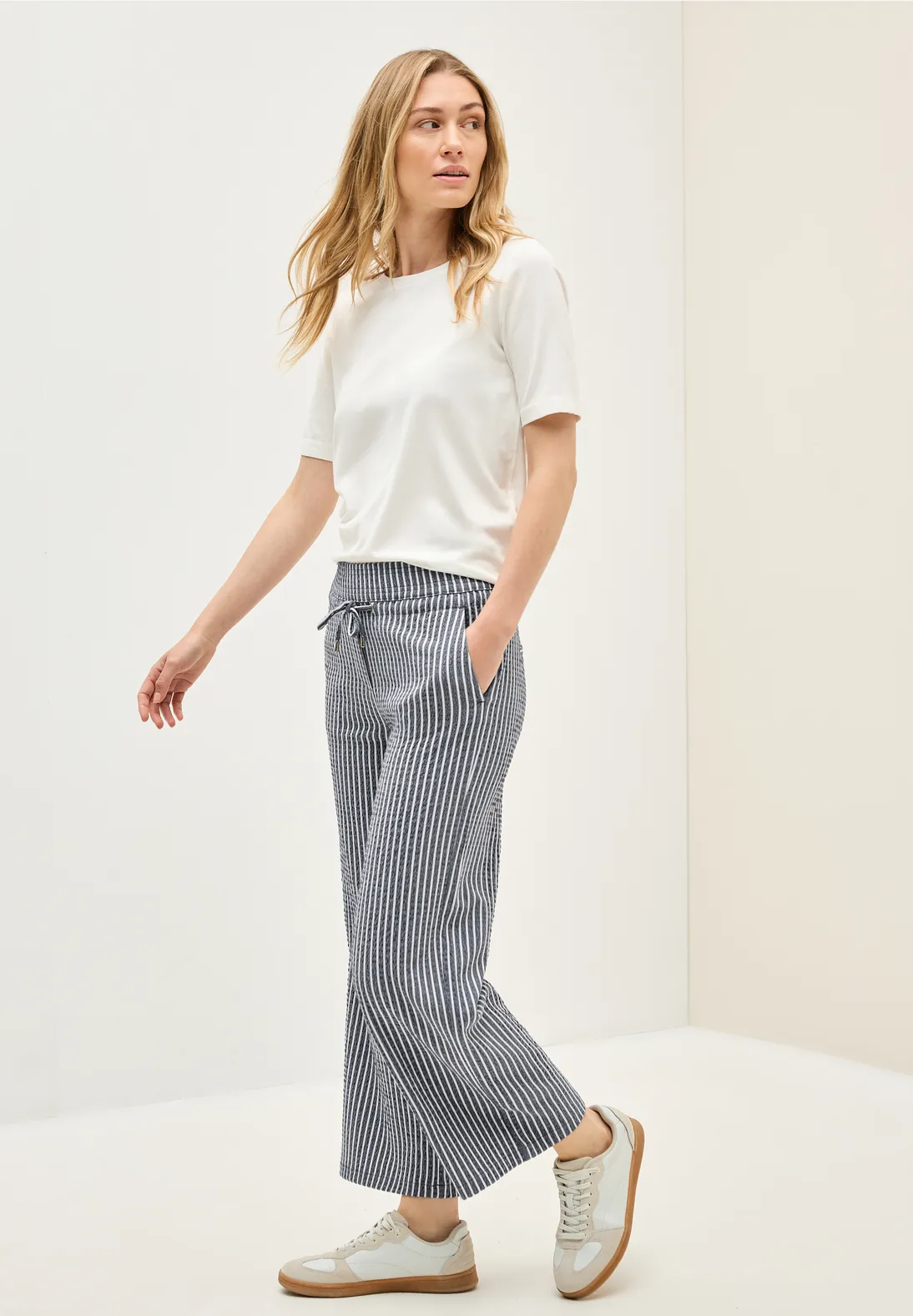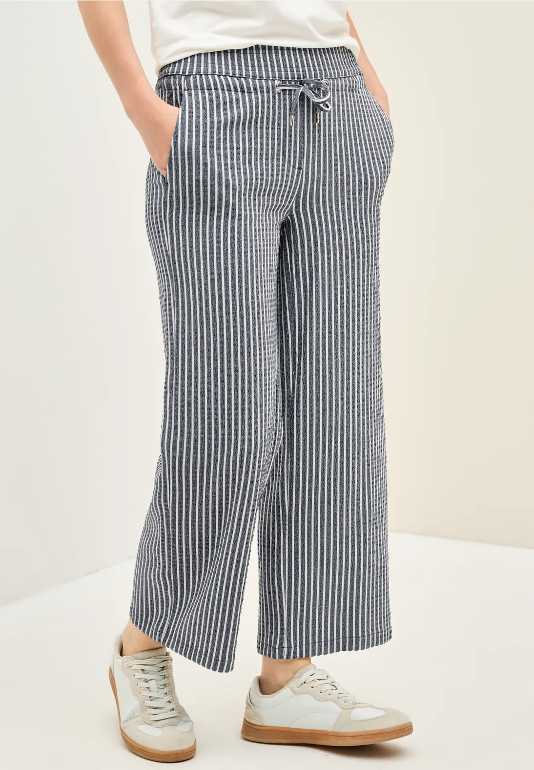 Cecil Neele. Cecil broek met een loose fit en wijde broekspijpen in een zomerse lengte. Deze Cecil broek heeft een elastische tailleband, koordsluiting en steekzakken. Het zomerse streeppatroon en gestructureerde seersucker stof maken het geheel compleet.