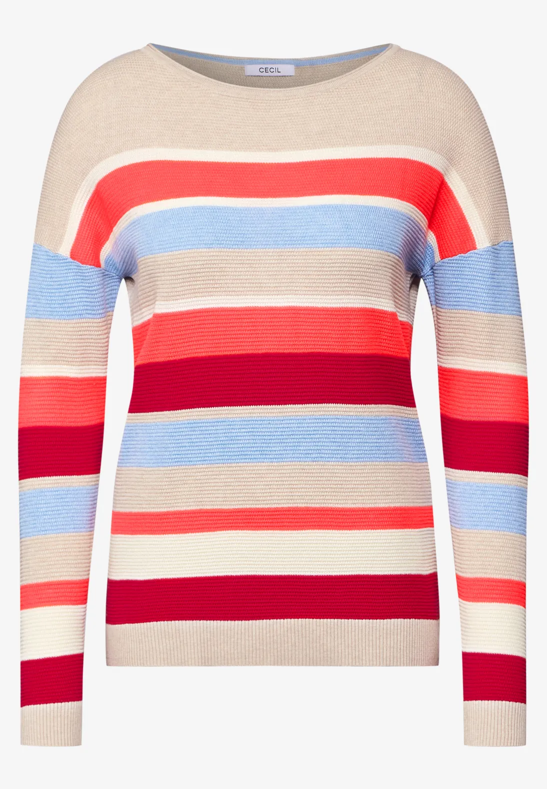 Cecil trui met lange mouwen, een boothals en kleurrijke strepen met structuur. Deze casual Cecil trui is gemaakt van een katoenmix.