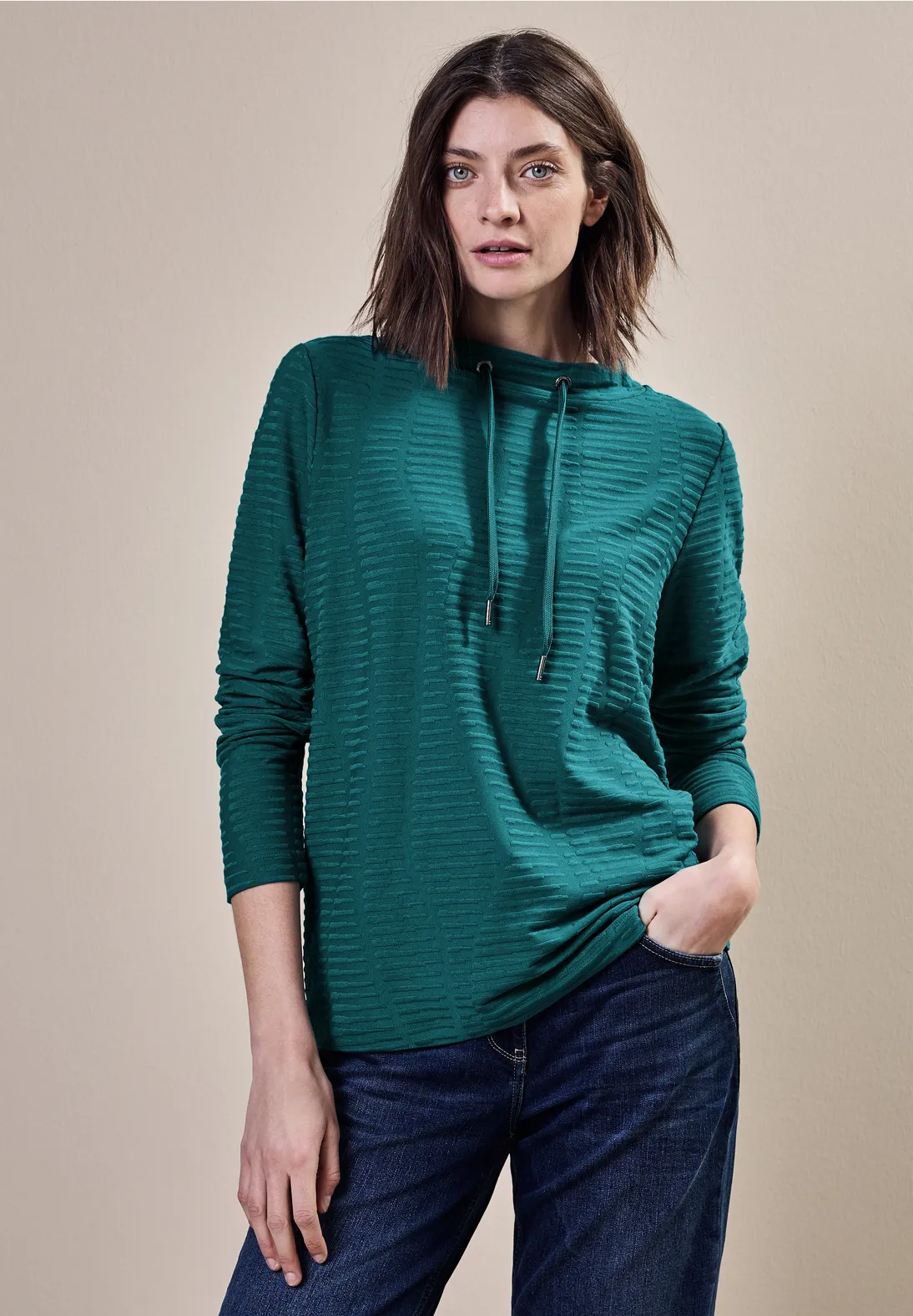 Cecil shirt met lange mouwen, een kraag met trekkoord en een modern structuurpatroon. Dit Cecil shirt is gemaakt van een zachte viscosemix met stretch.