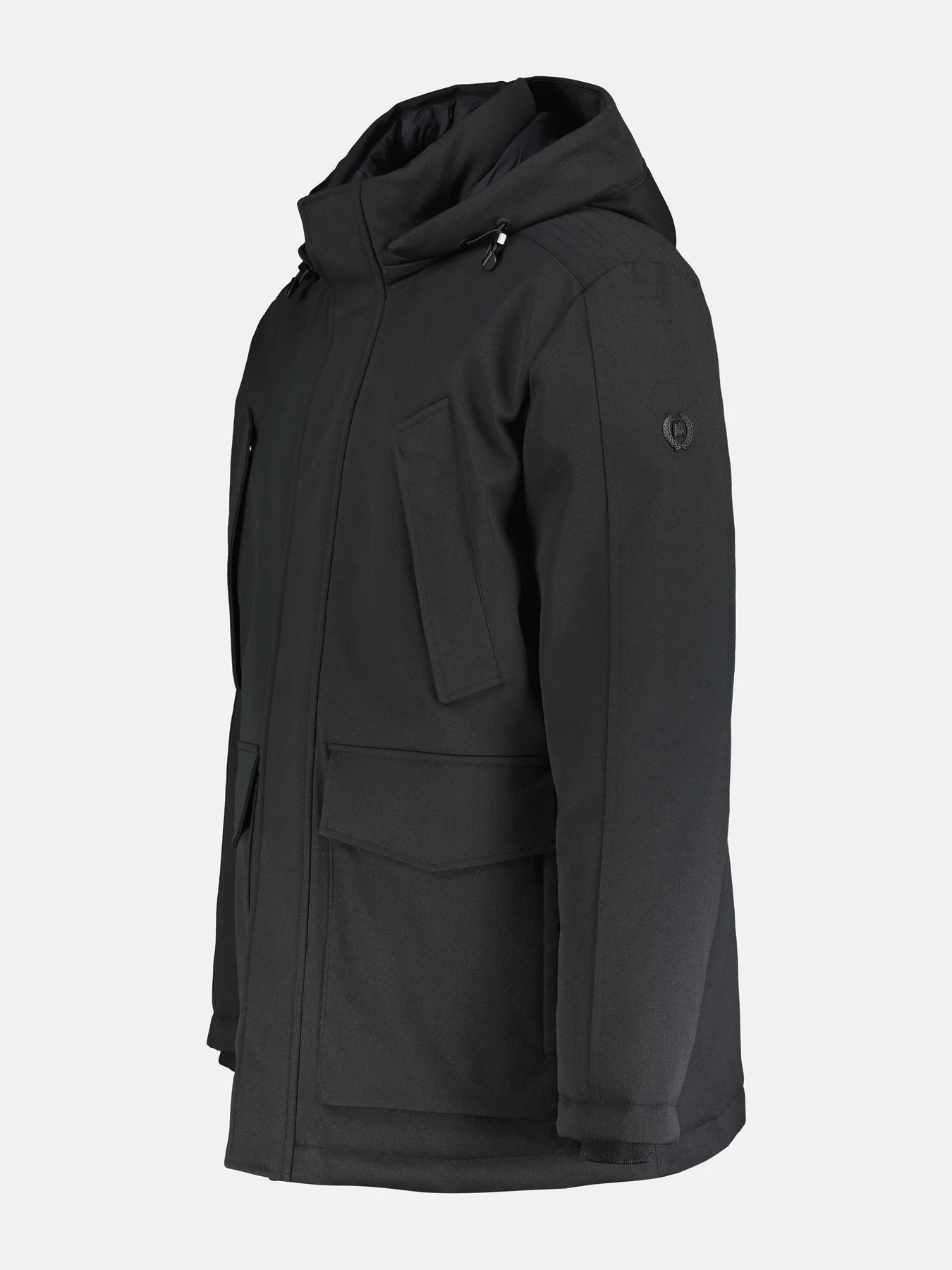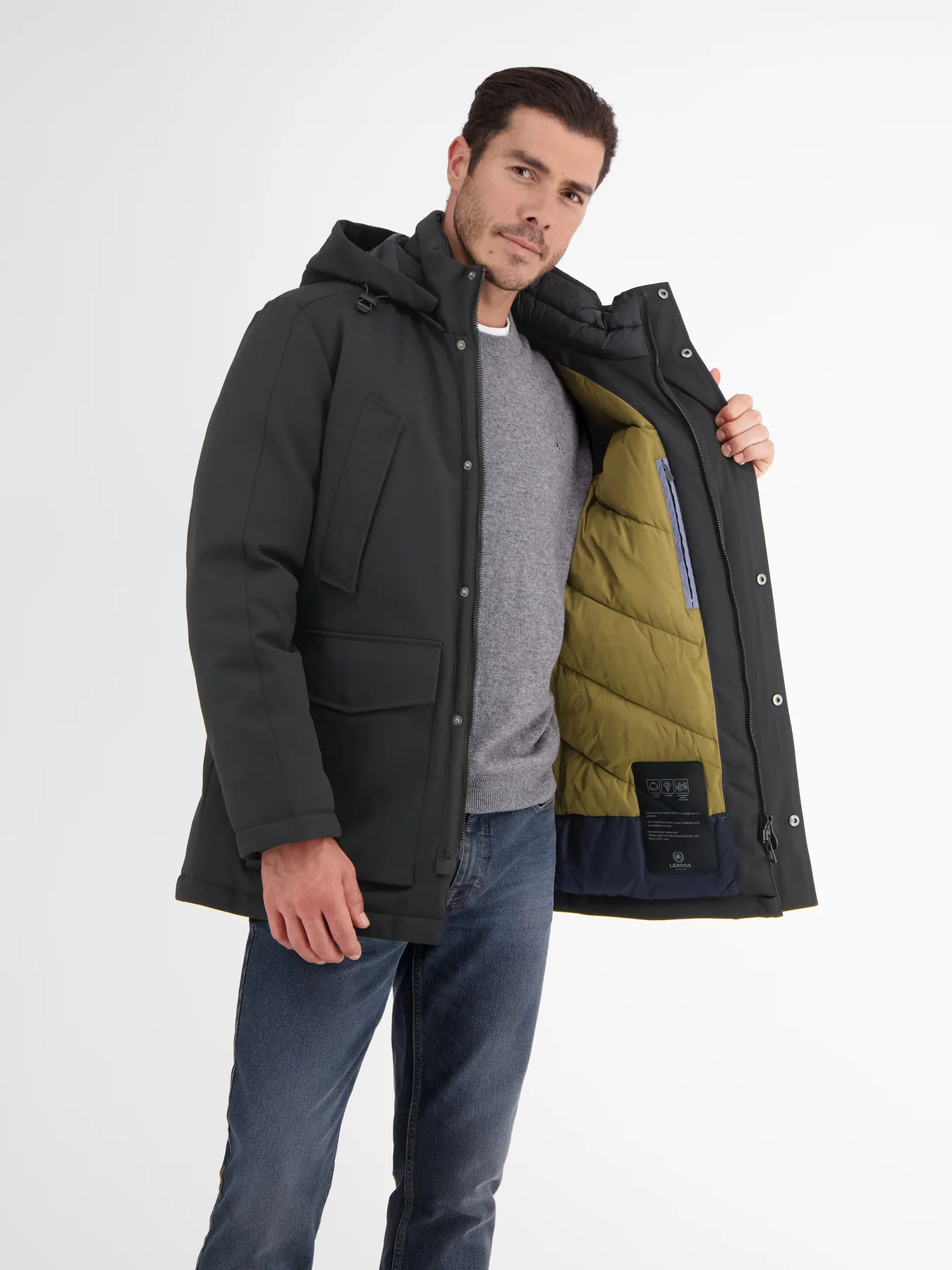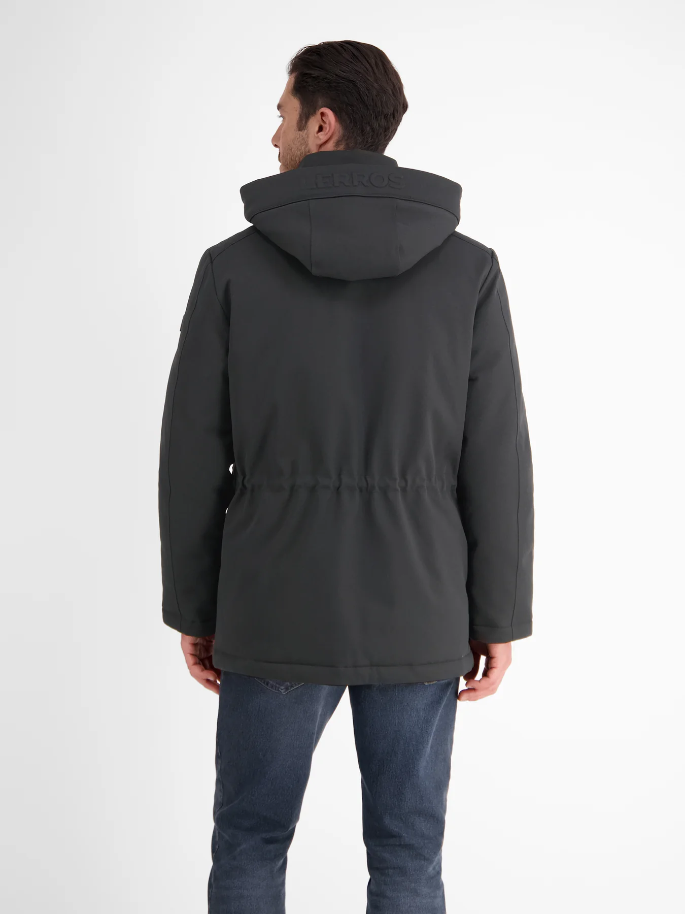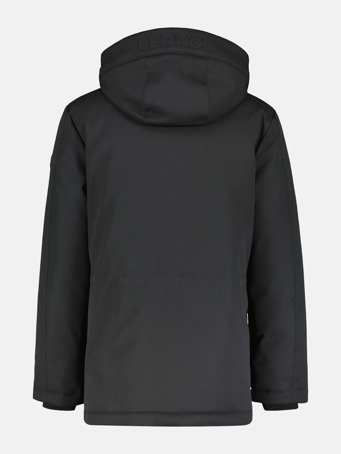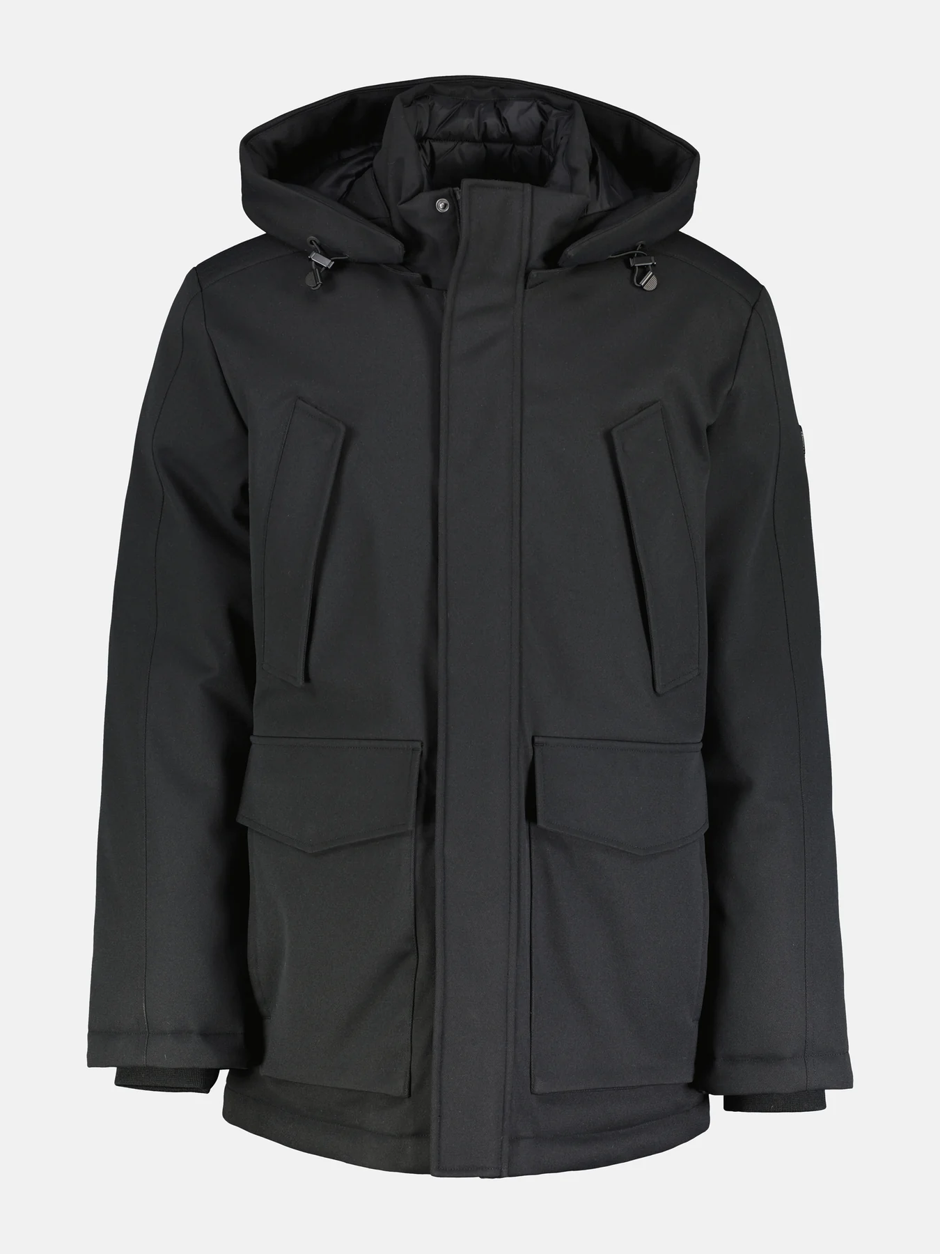 Sportief en functioneel Lerros jack met capuchon en talrijke zakken. Deze Lerros jas heeft een staande kraag en wordt gesloten met een ritssluiting en drukknopen. De capuchon met trekkoord is gevoerd en afneembaar. De ribboorden aan de mouwen zorgen voor extra warmte.