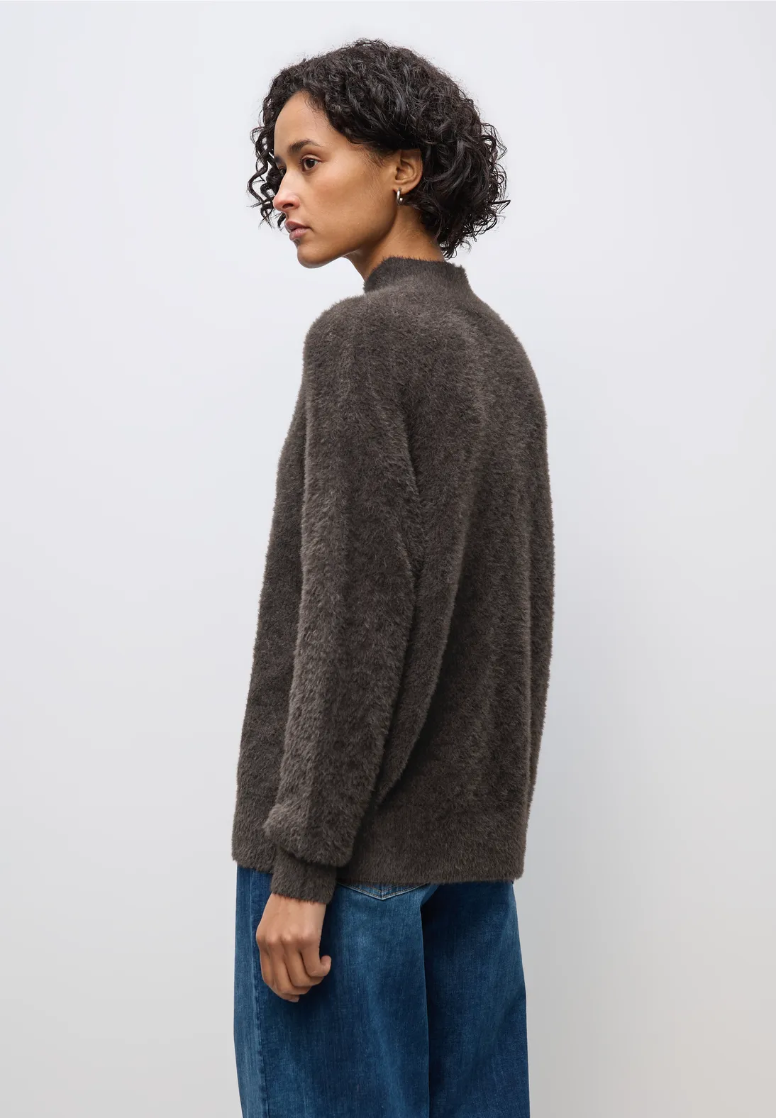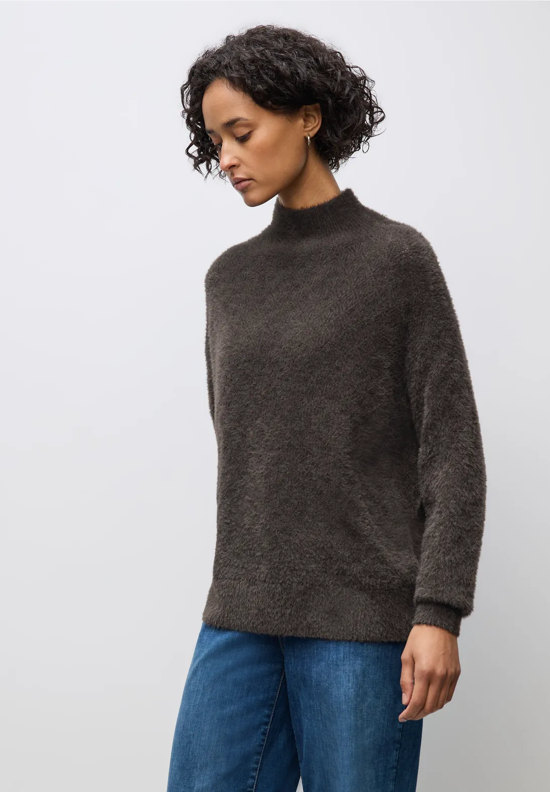 Deze comfortabele gebreide coltrui van Street One in deep roast brown is perfect voor frisse dagen. Het zachte structuurpatroon, de lange mouwen en de warme col zorgen voor een stijlvolle en gezellige look. Ideaal voor casual én trendy outfits.