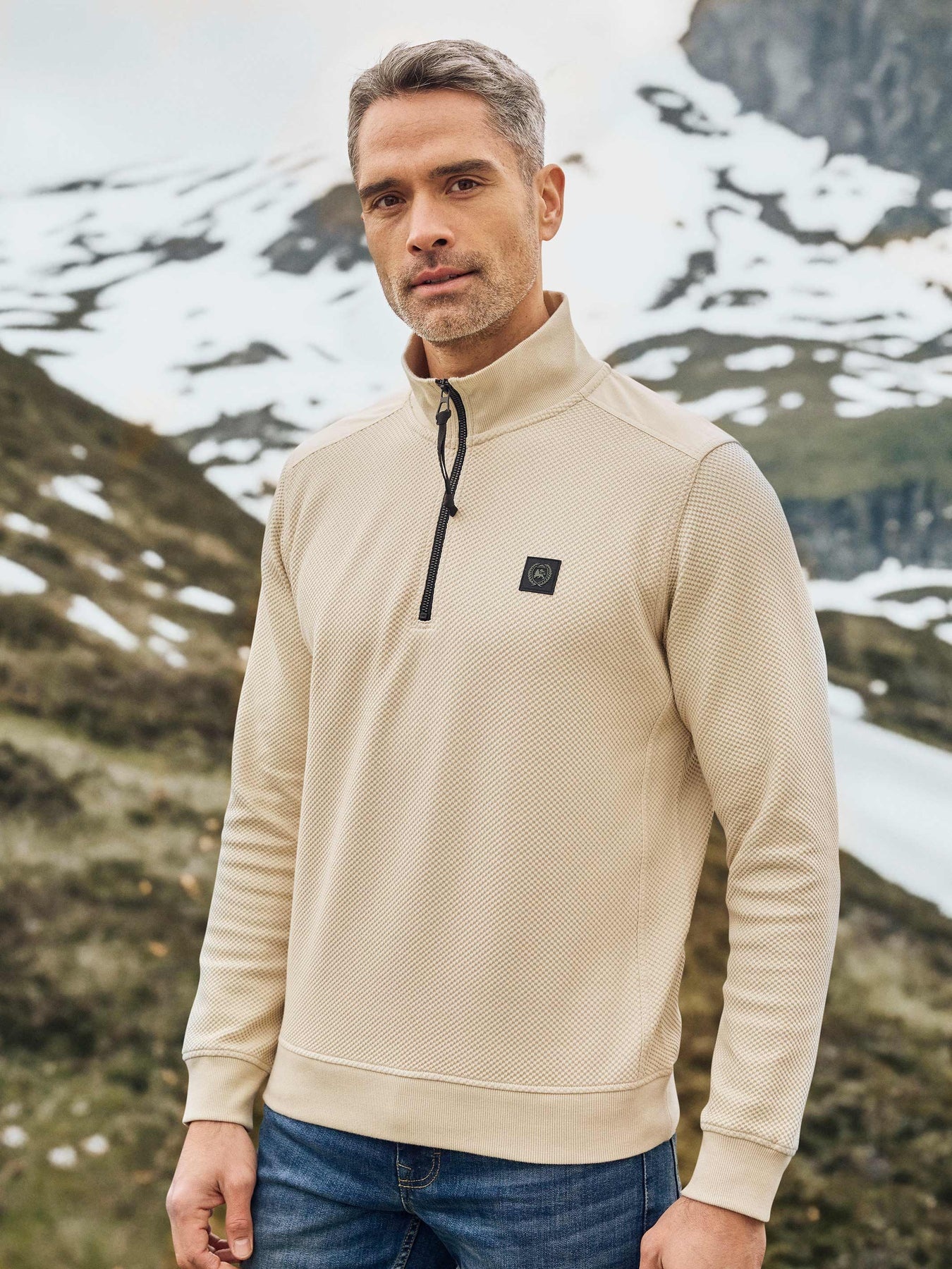 De klassieke troyer-stijl met hoge kraag en ritssluiting geeft de trui een sportief en verzorgd karakter, terwijl de zachte katoenen structuur zorgt voor een aangename pasvorm en warm draagcomfort.
