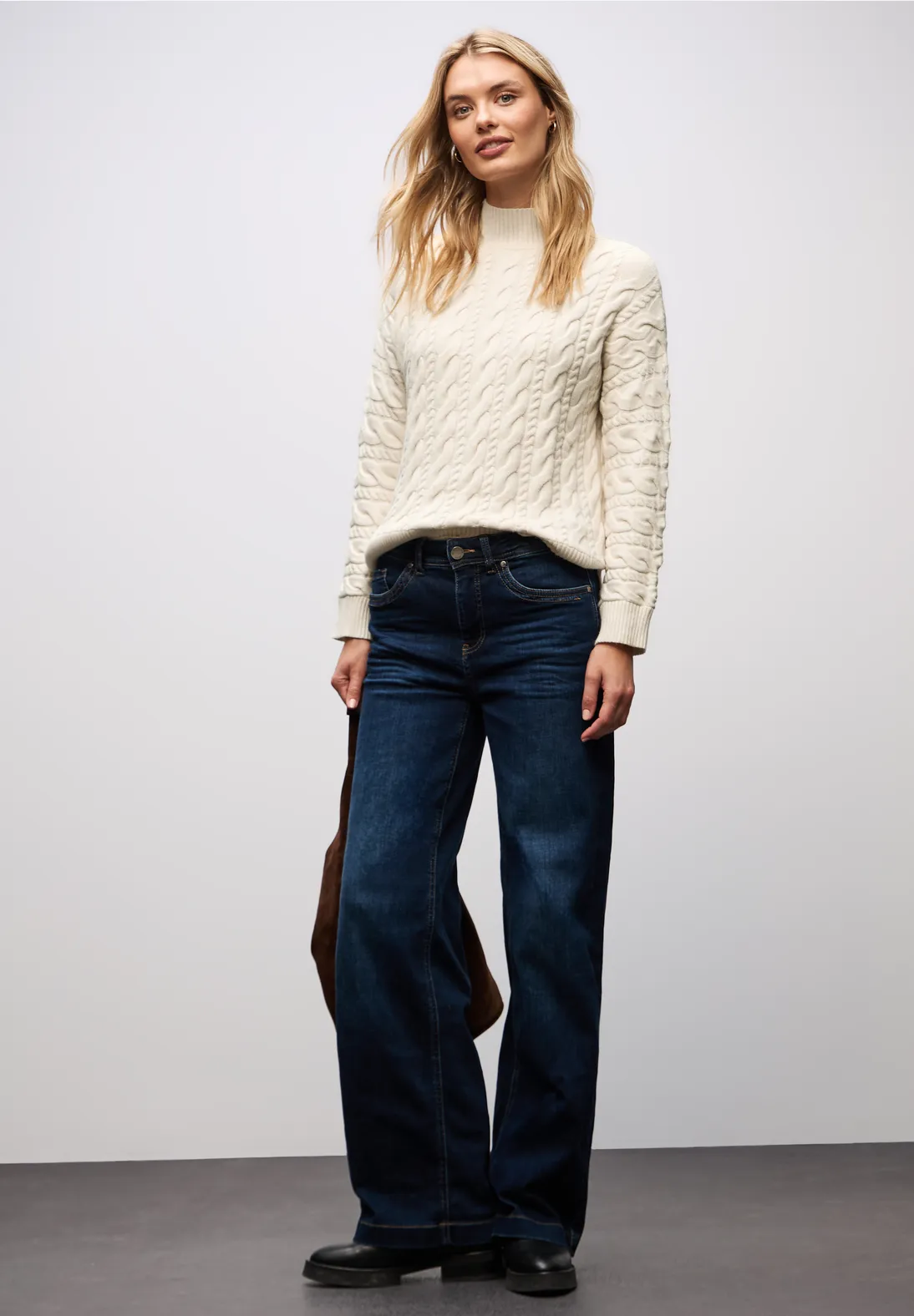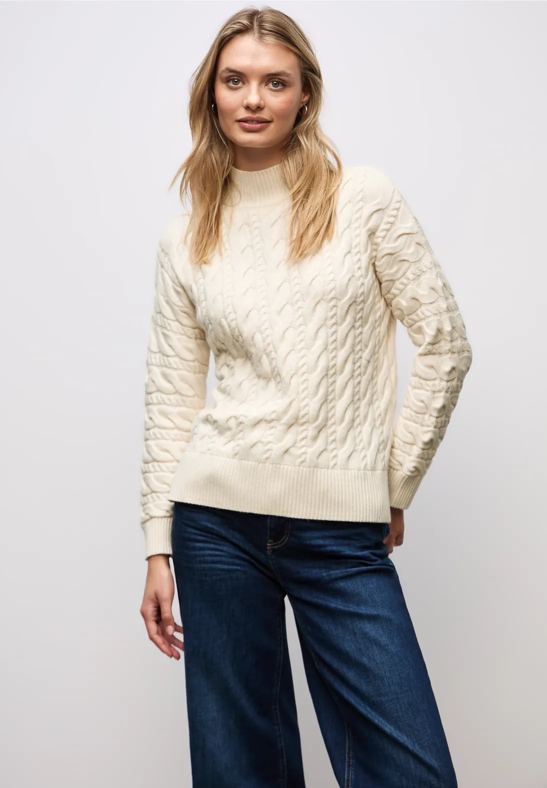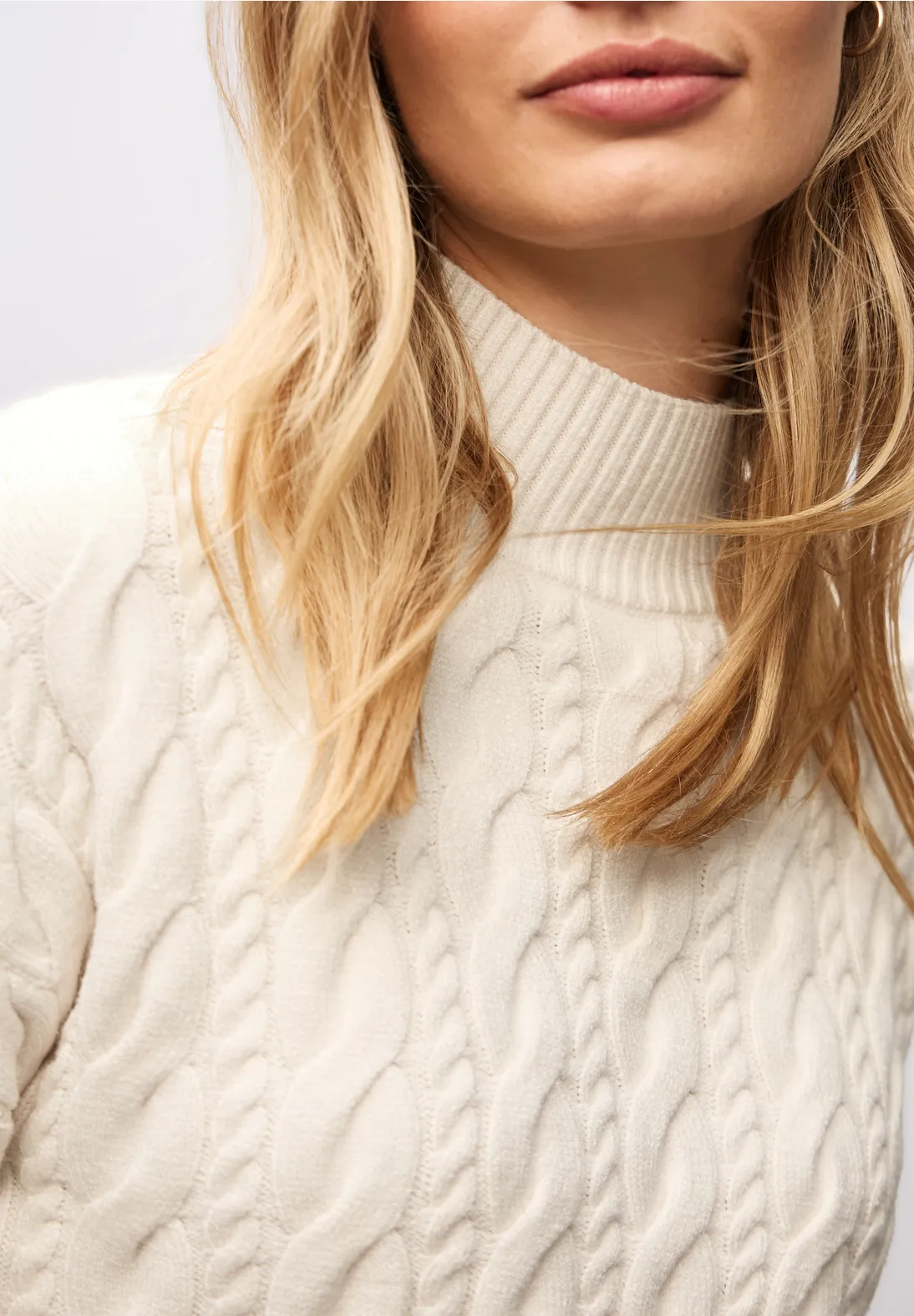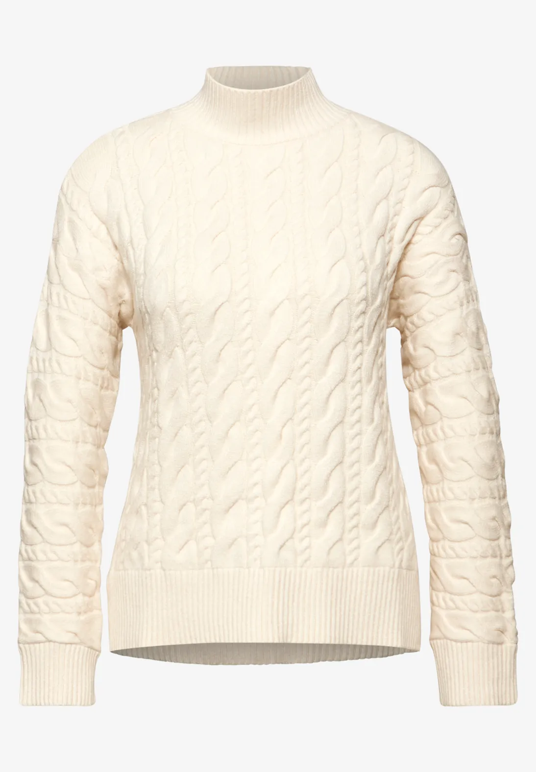 Met deze gebreide trui van Street One voeg je direct een dosis winterse charme toe aan je garderobe. De zachte kleur Soft Beige geeft een warme en tijdloze uitstraling, terwijl het klassieke kabelpatroon zorgt voor een verfijnde look die nooit uit de mode raakt.