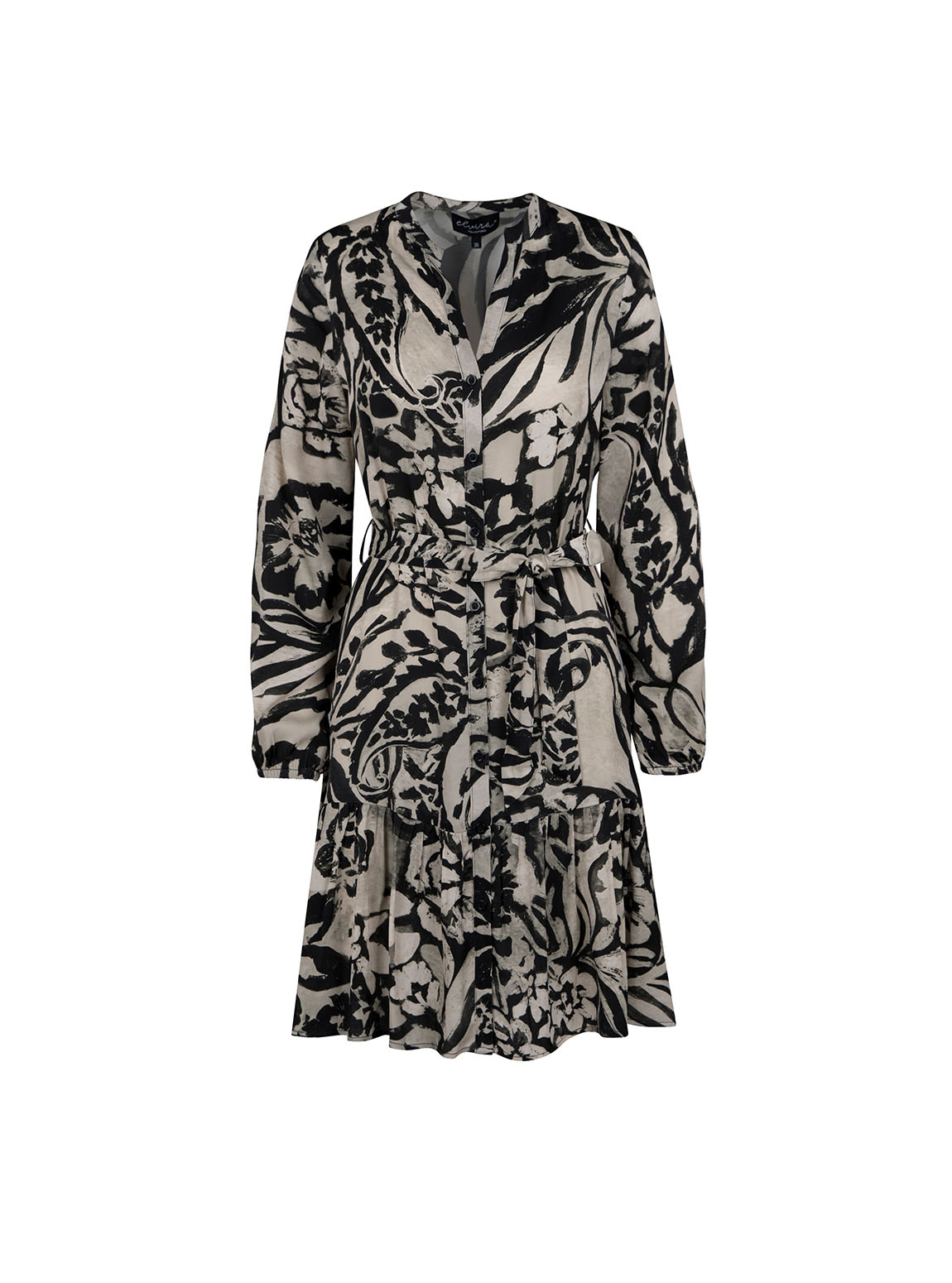 Elvira Collections Jurk Quinty. Elvira Collections jurk met lange mouwen, een V-hals en een allover print. Deze Elvira jurk heeft een ceintuur in de taille en een doorlopende knoopsluiting.