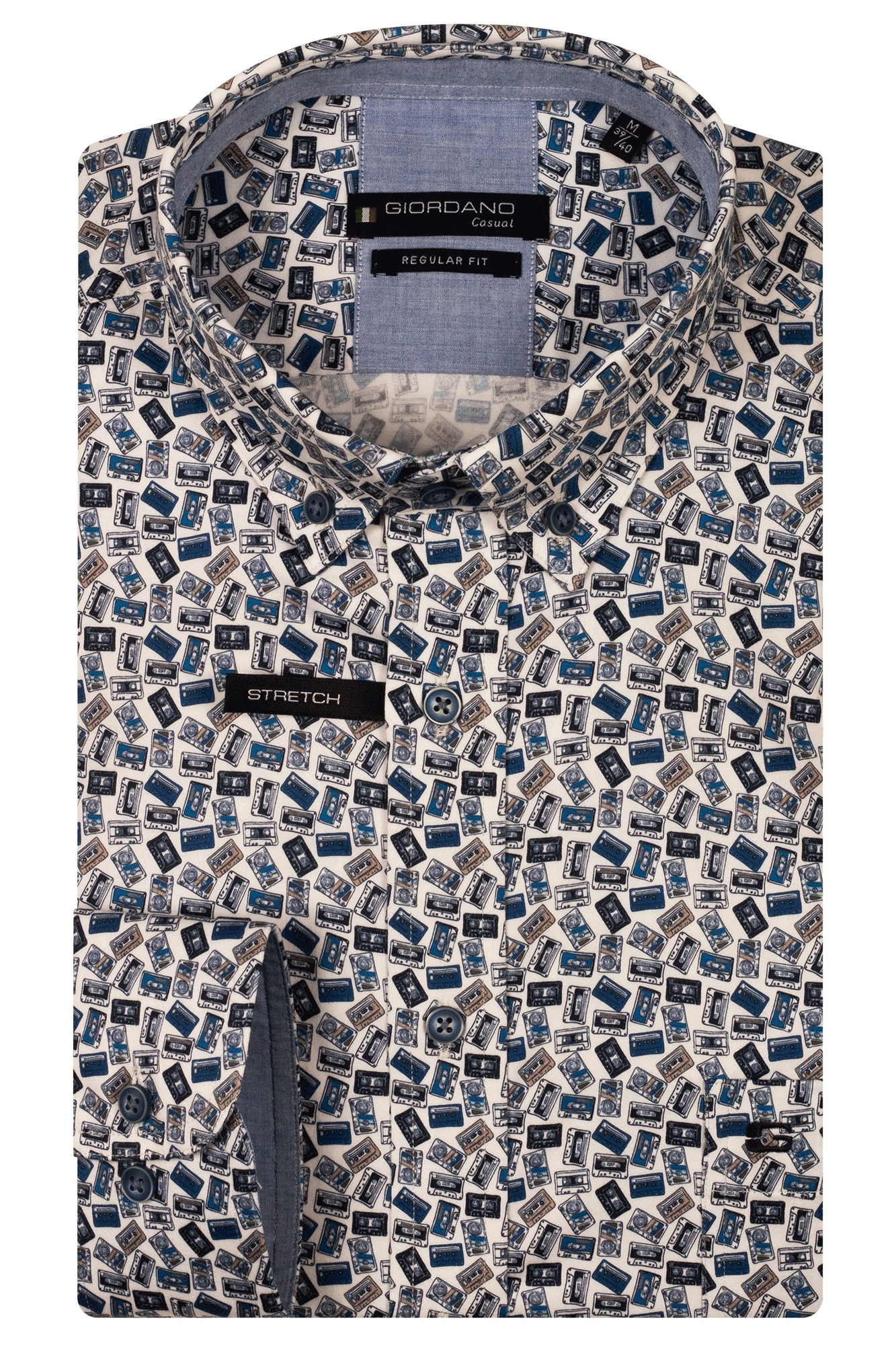 Giordano overhemd met korte mouwen, een button-down kraag en een regular fit. Dit Giordano overhemd is voorzien van een borstzak en een allover print met casette tapes.