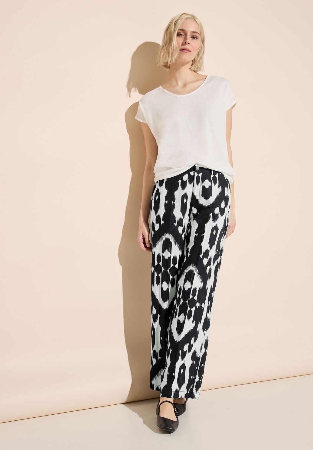 Street One linnen broek met een loose fit, hoge taille en wijde broekspijpen. Deze Street One broek wordt gesloten met een knoop en ritssluiting en heeft een elastiek aan de achterkant van de tailleband. De allover print en steekzakkenm maken het geheel compleet. Gemaakt van luchtig linnen.