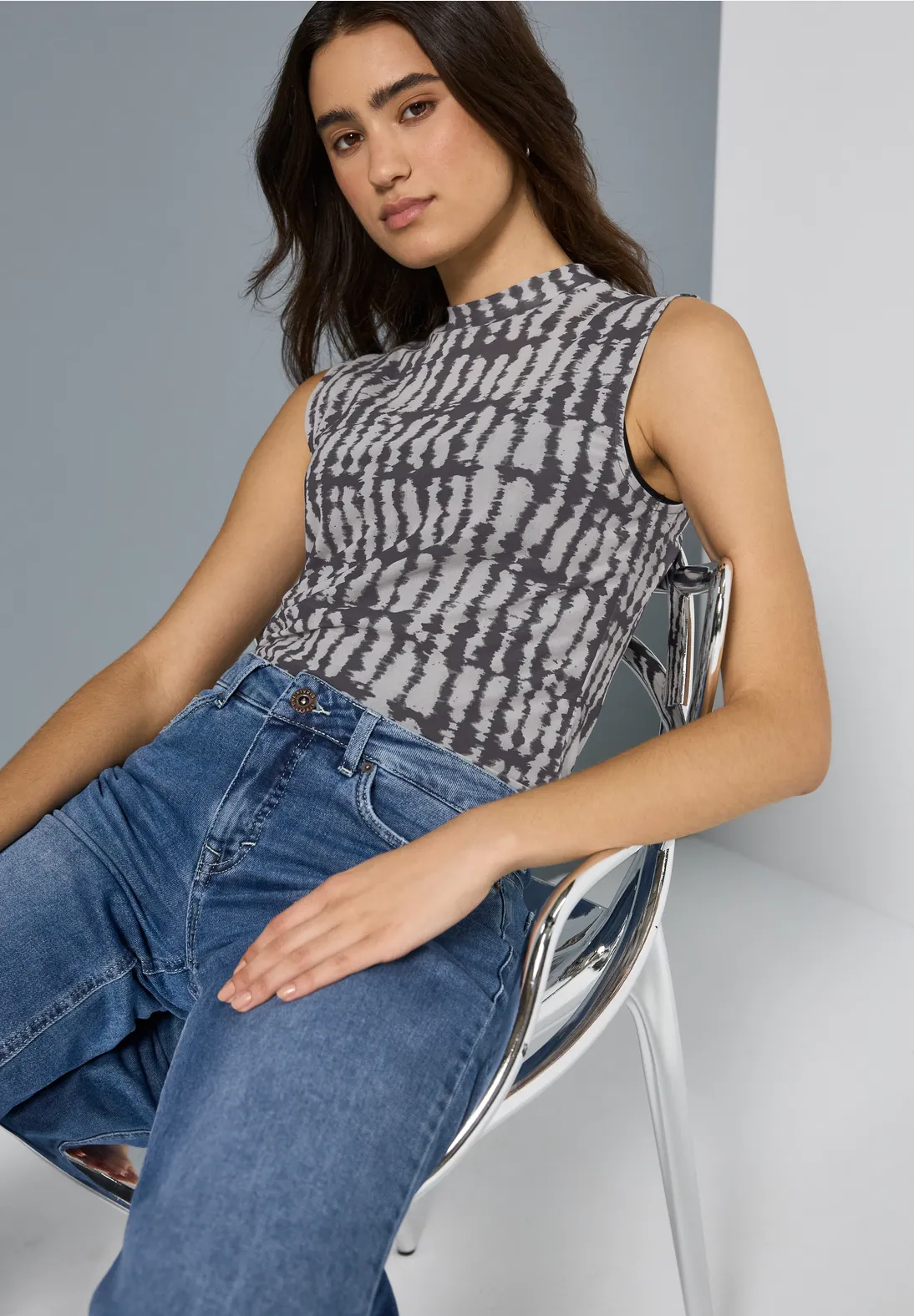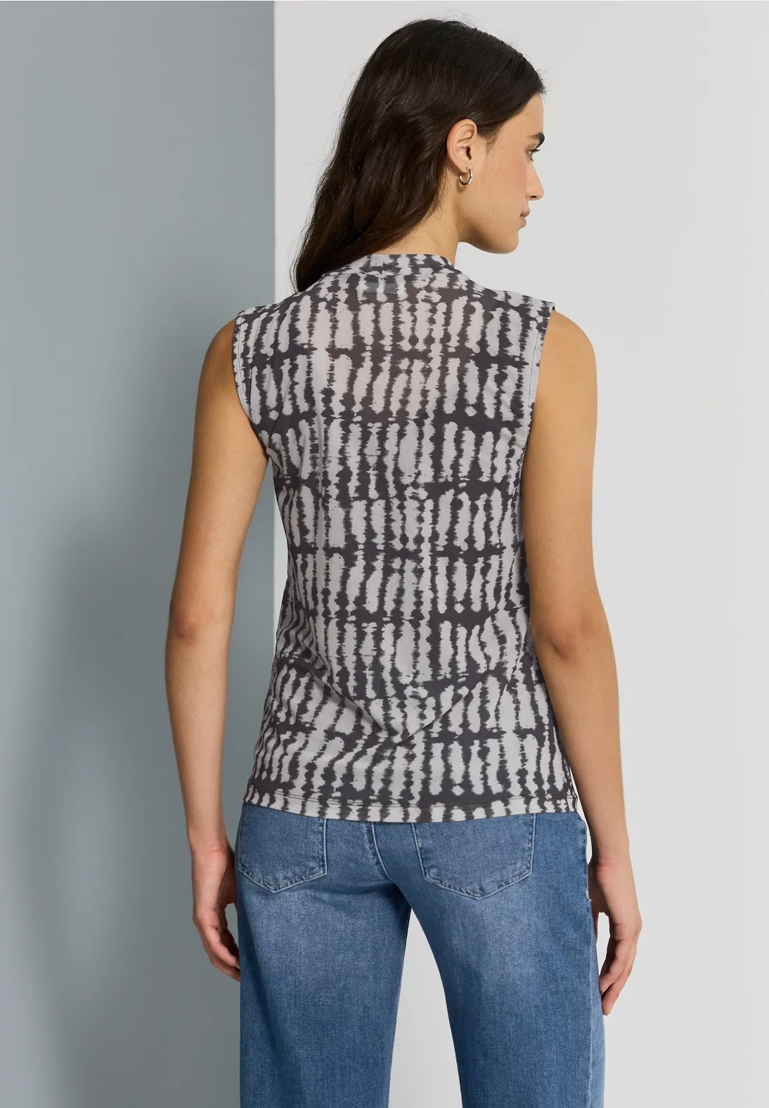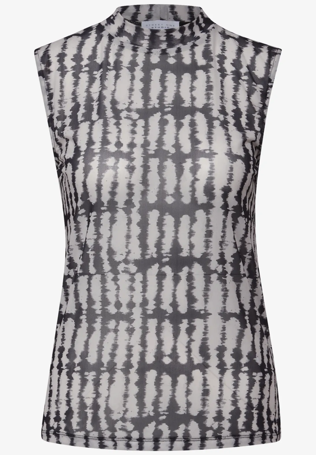 Mouwloze Street One Studio top met een grafische print en een hoge hals. Het materiaal is licht en semi-transparant.