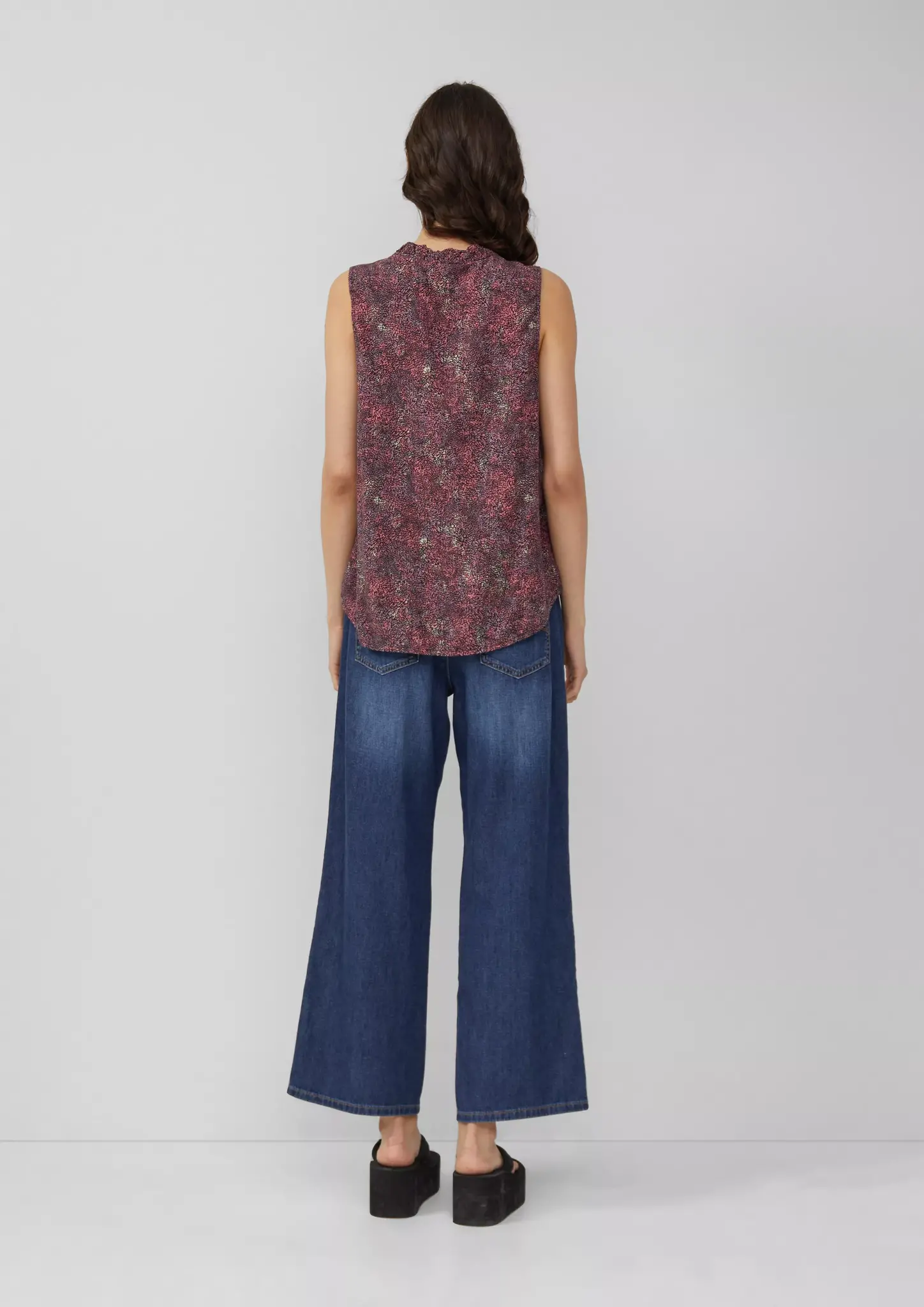 Mouwloze QS by S. Oliver top met een ronde hals met split, allover print en kraag met ruches. De allover print maakt deze QS top compleet.