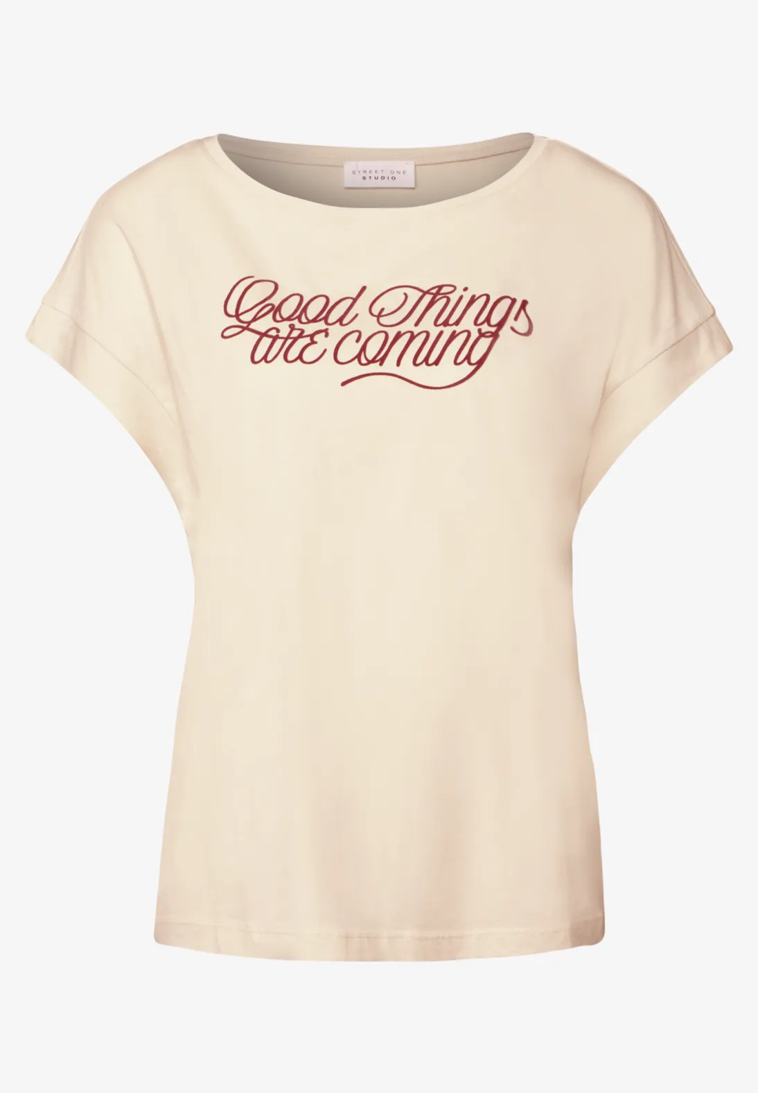 Street One Studio shirt met korte mouwen, verlaagde schouders en een ronde halslijn. Dit Street One Studio shirt heeft een tekst op de voorkant en is gemaakt van een zachte katoen-modalmix.