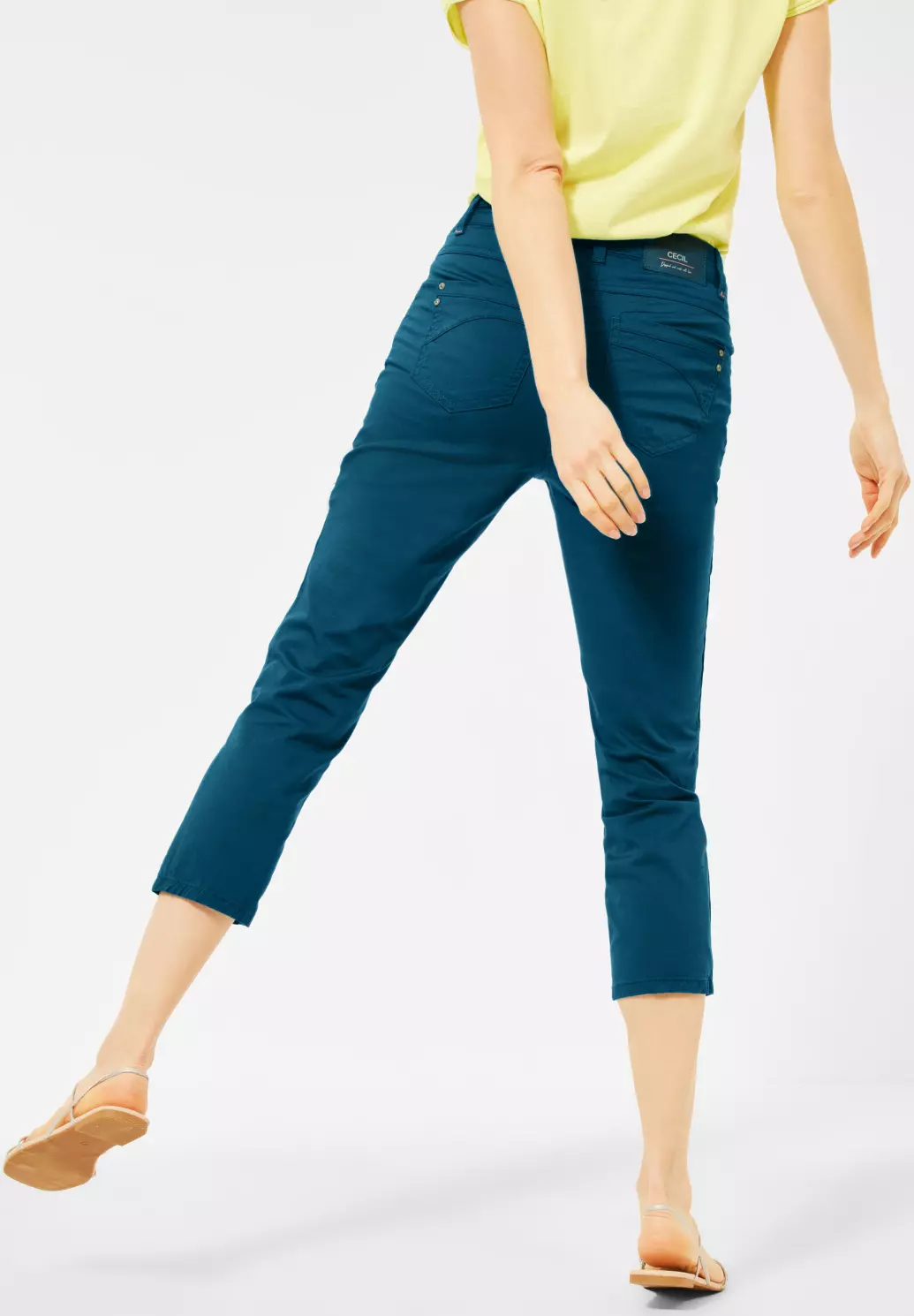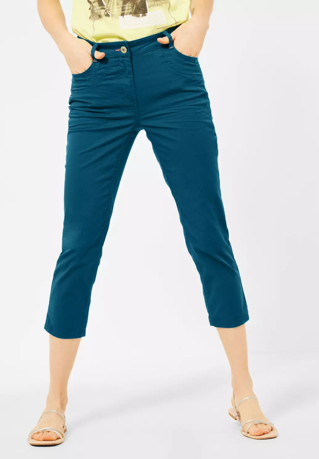 Cecil Toronto. Cecil broek met een slim fit, hoge taille en slanke broekspijpen in een zomerse 7/8-lengte. Deze Cecil broek wordt gesloten met een ritssluiting en knoop.