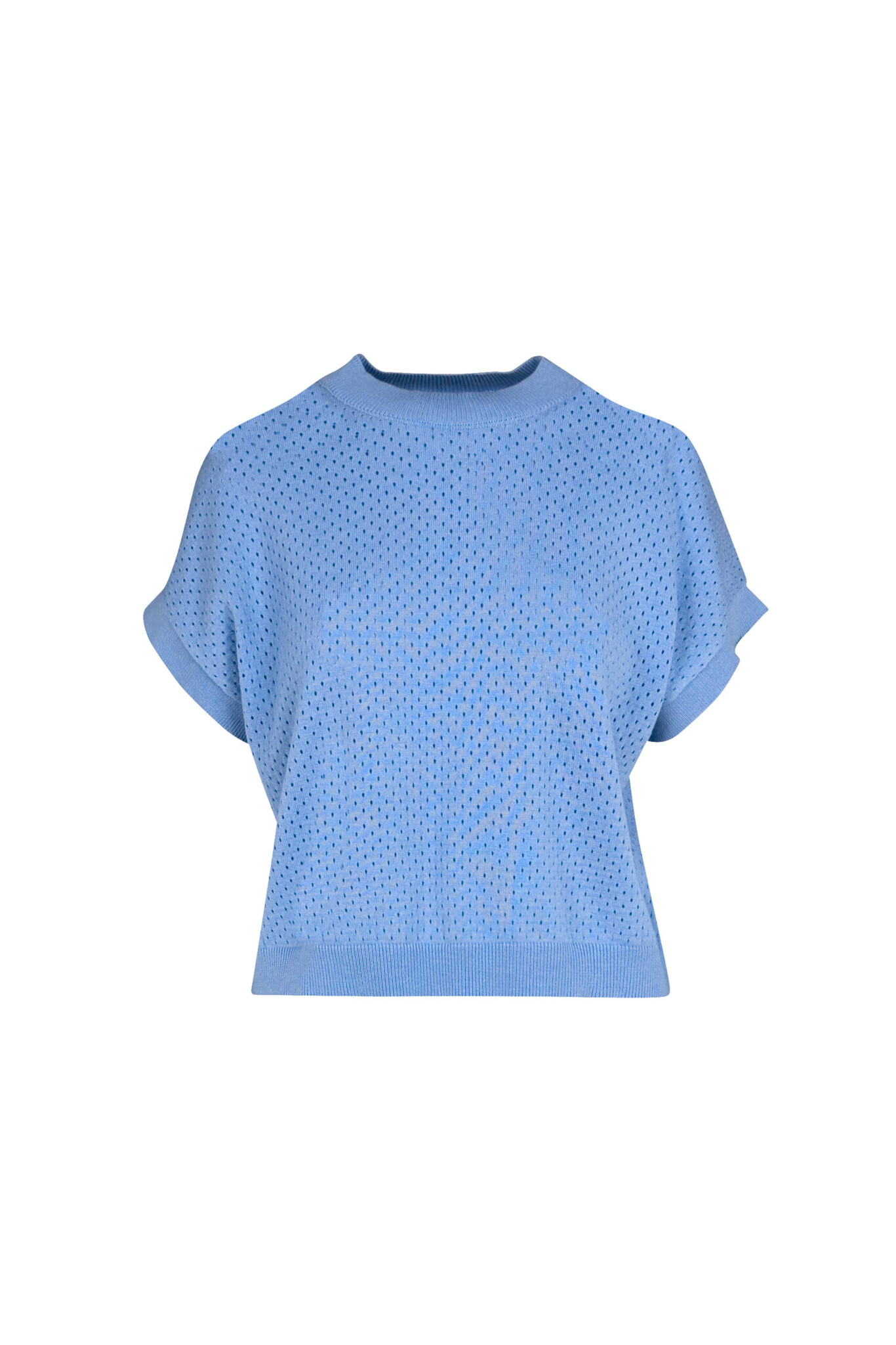 Elvira Collections Sanni. Fijngebreide Elvira Collections trui met korte mouwen, een hoge hals en een opengewerkt patroon. De ribboorden maken het geheel compleet.