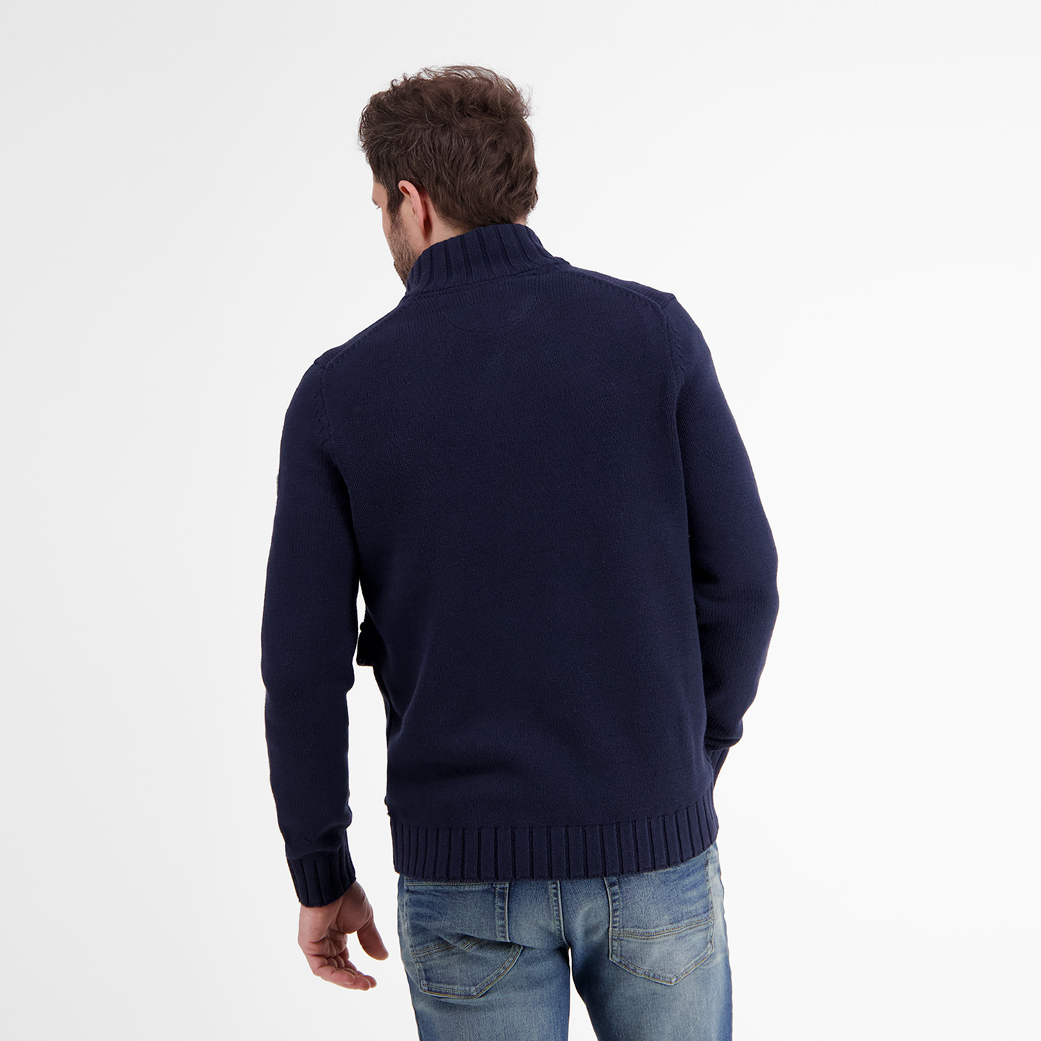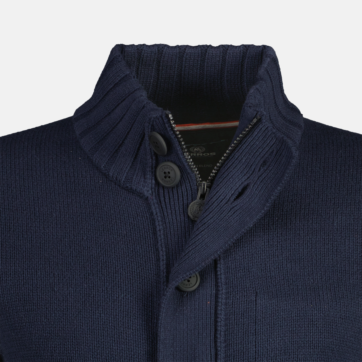 Lerros vest met lange mouwen, een opstaande kraag en klepzakken. Dit Lerros vest wordt gesloten met een ritssluiting en grote knopen. Gemaakt van een grof breisel van een hoogwaardige katoenmix.