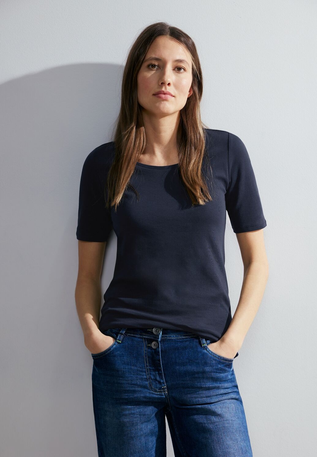 Cecil Lena. Cecil basis shirt met halflange mouwen, een ronde hals en een minimalistische look. Dit Cecil t-shirt is gemaakt van een zachte, stevige jersey van biologisch geteeld "organic cotton".