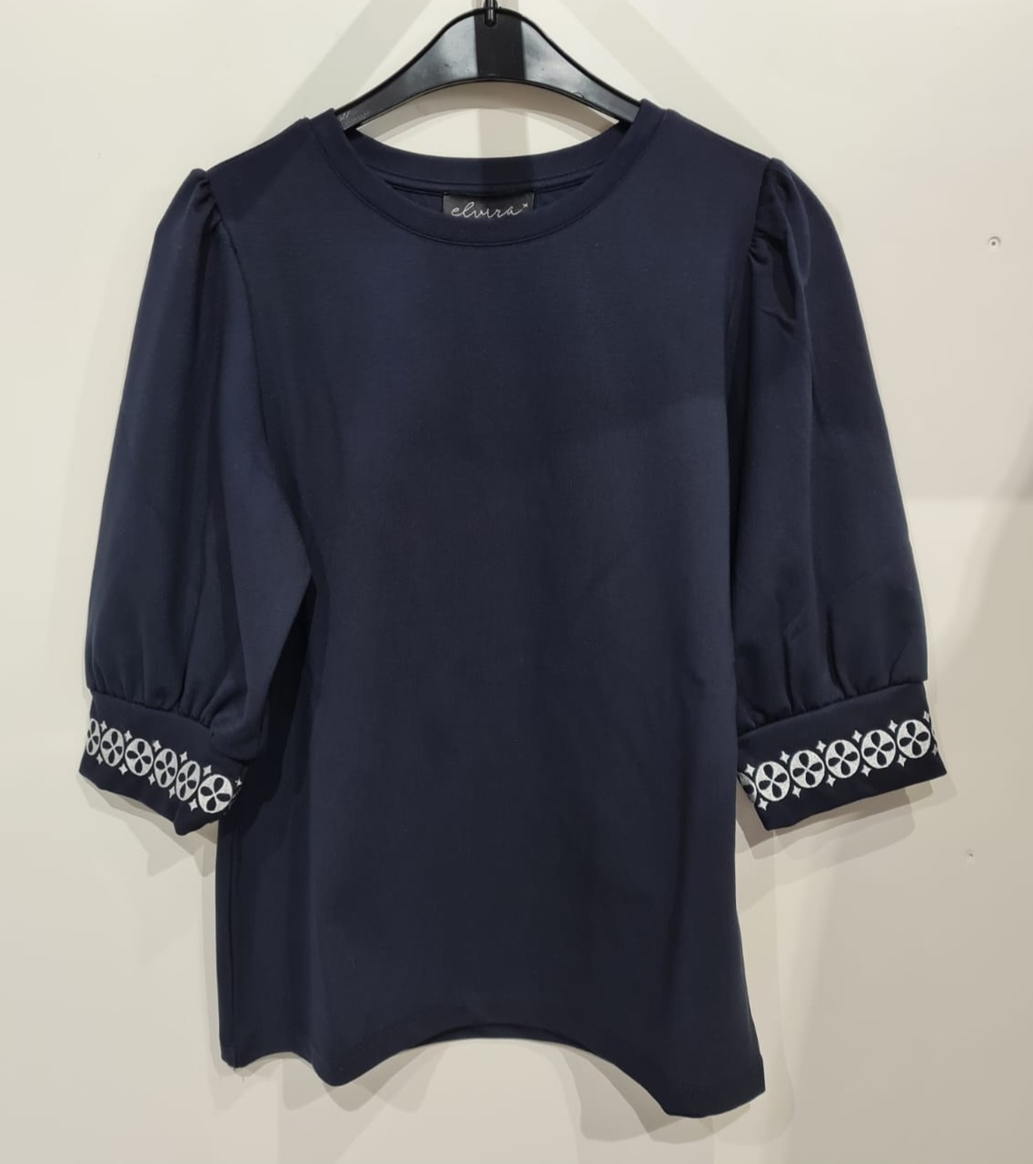 Elvira Collections Top Izzy. Elvira Collections shirt met een ronde hals, korte mouwen en plooien op de schouders. De mouwen zijn afgewerkt met een borduursel.