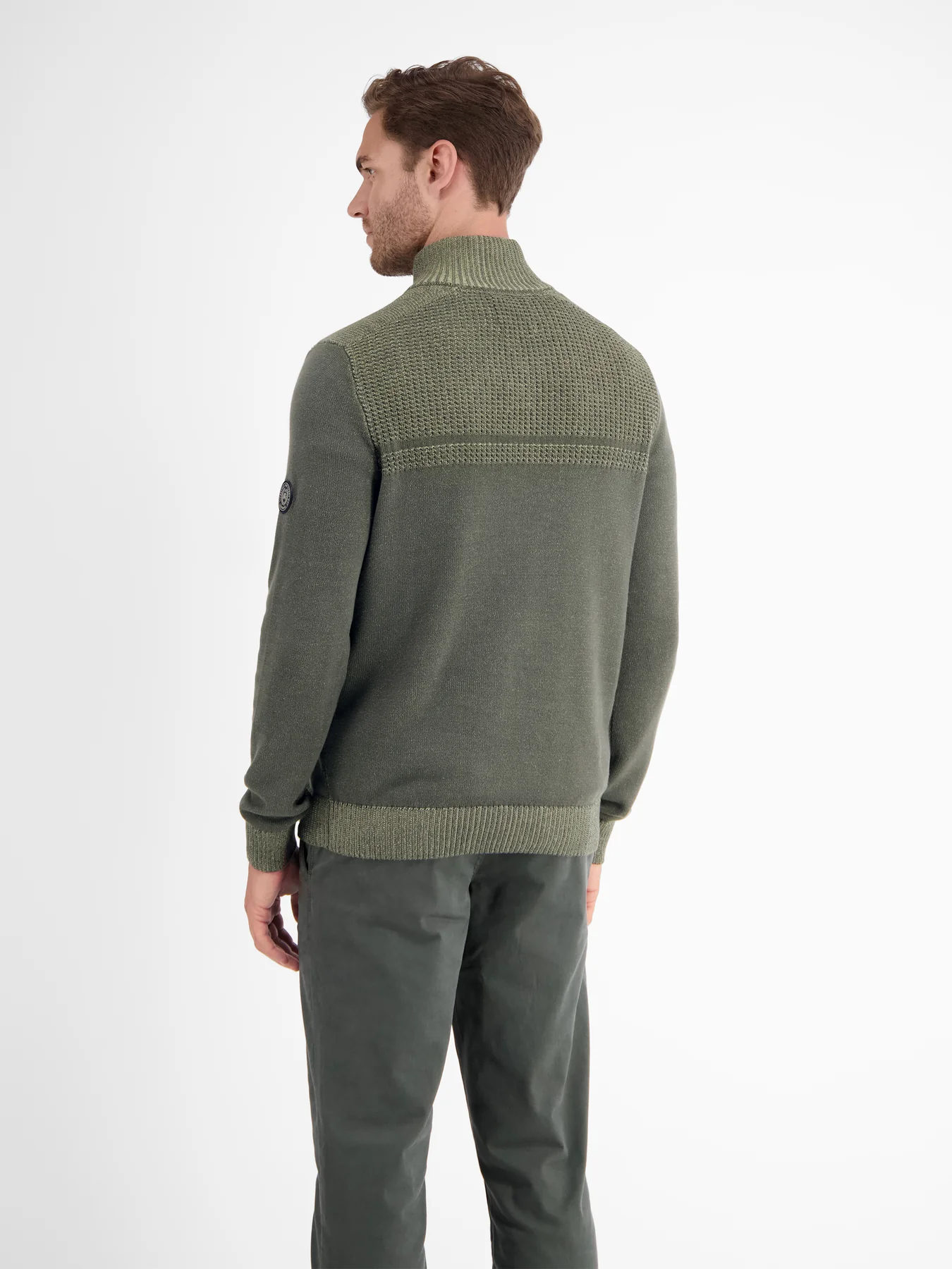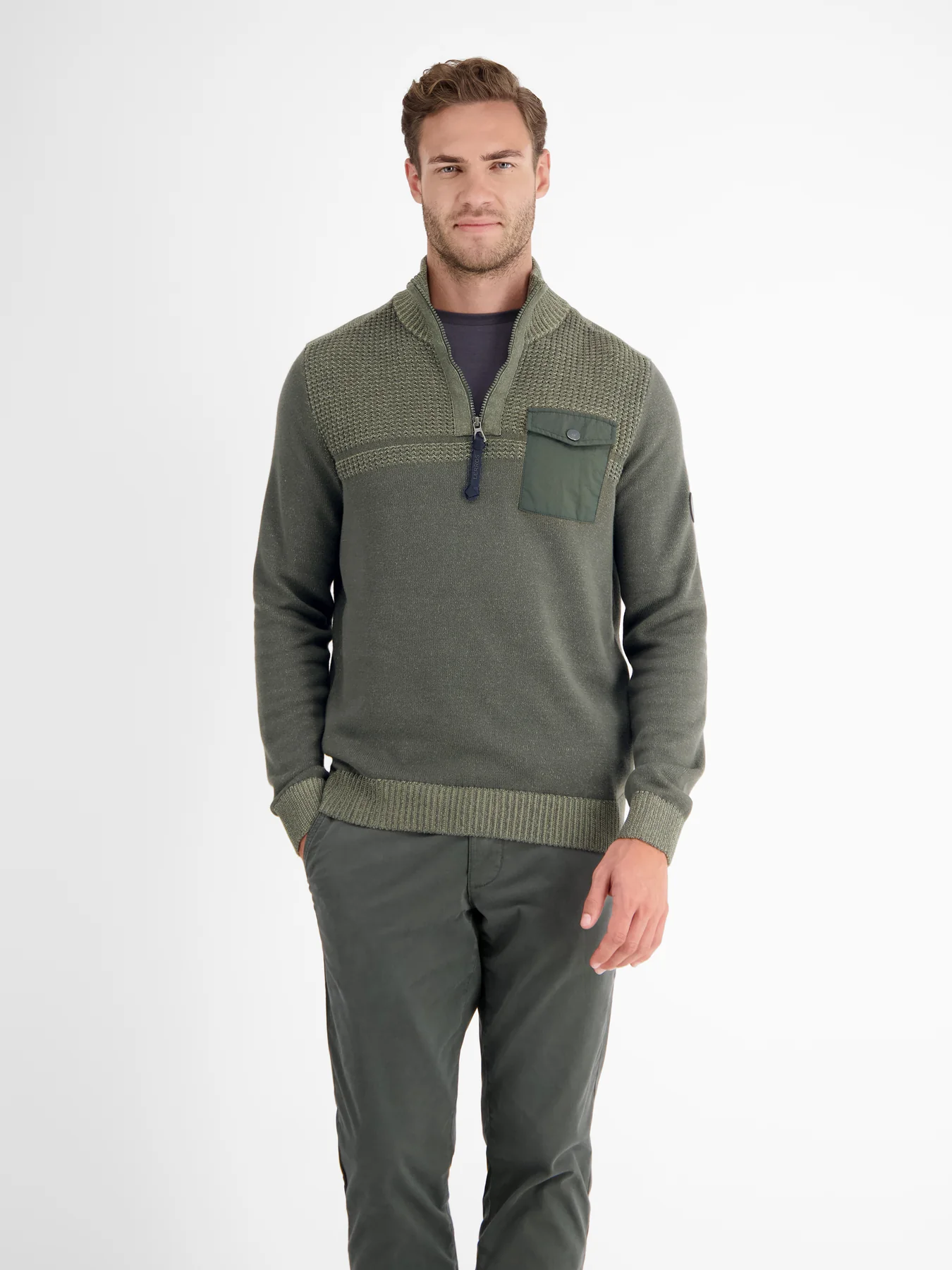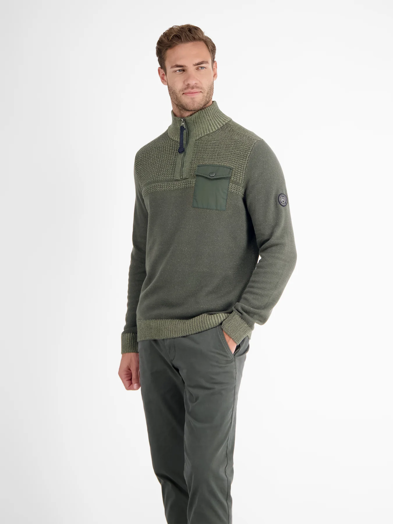 Gebreide Lerros trui met lange mouwen en een staande kraag met een ritssluiting. De sportieve ribboorden maken deze Lerros trui compleet.