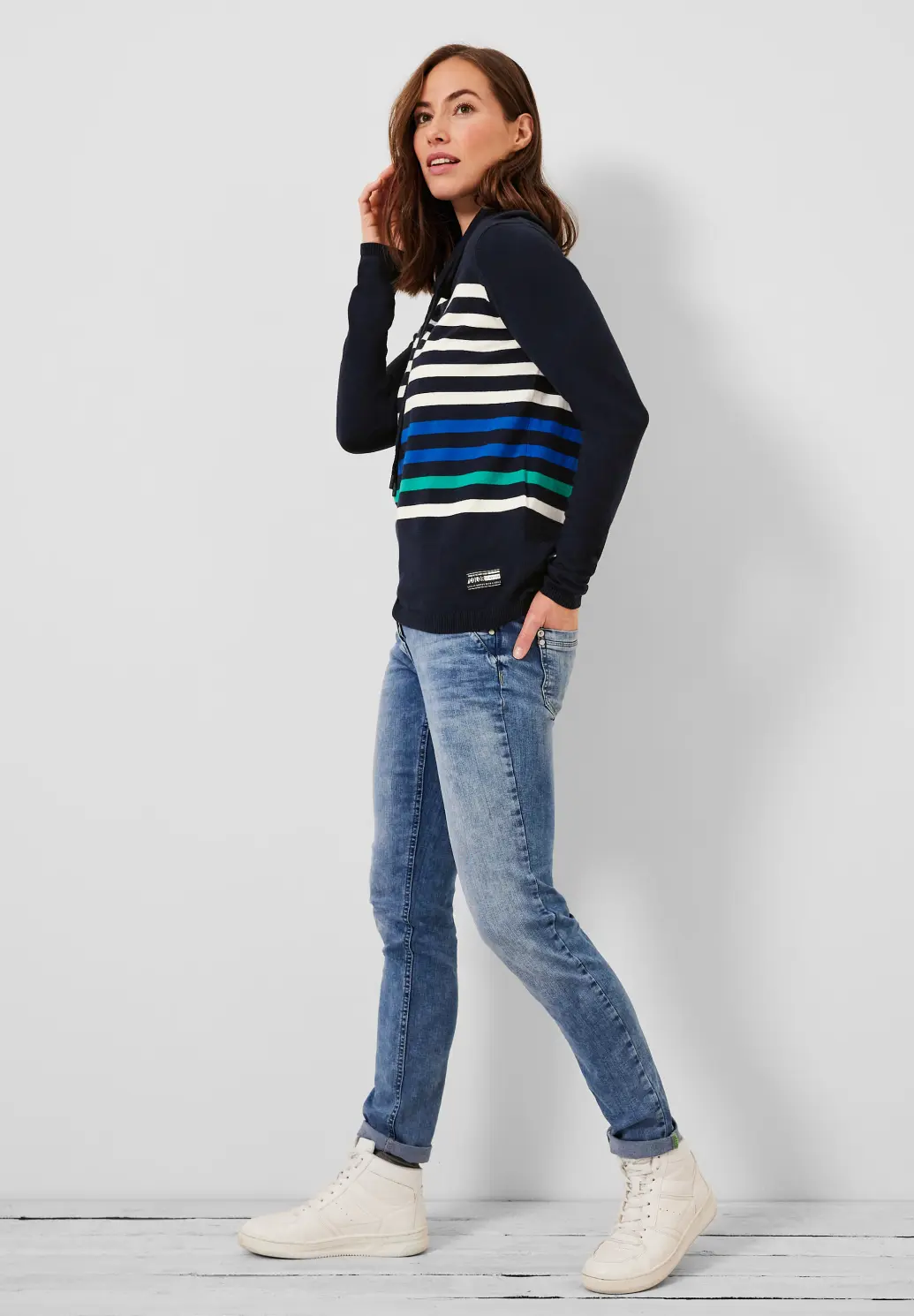 Cecil trui met lange mouwen, sportieve strepen en een los vallende kraag met trekkoord.