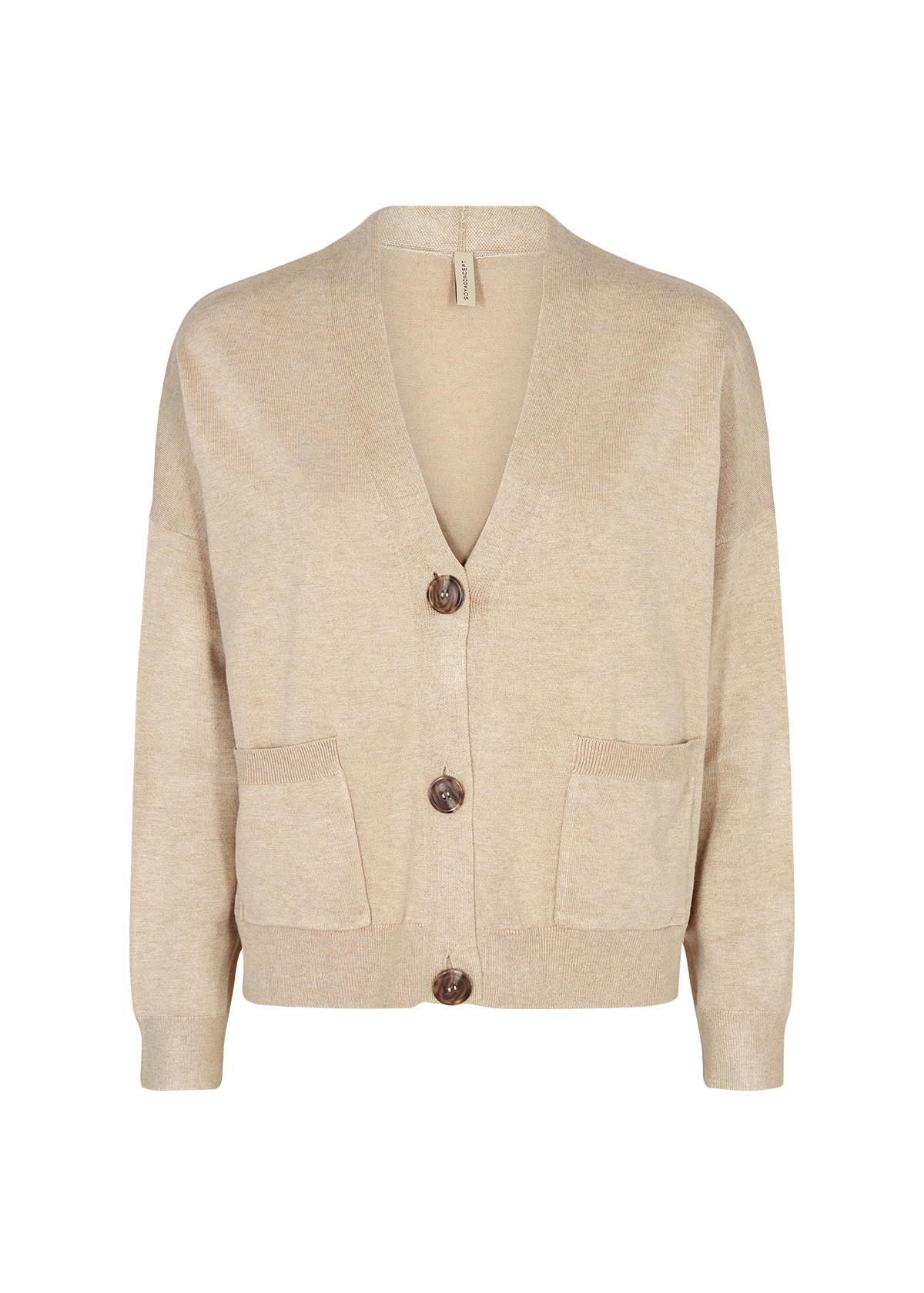 Soyaconcept SC-Dollie 723. Zacht gebreid Soyaconcept vest met lange mouwen, een V-hals en een knoopsluiting.