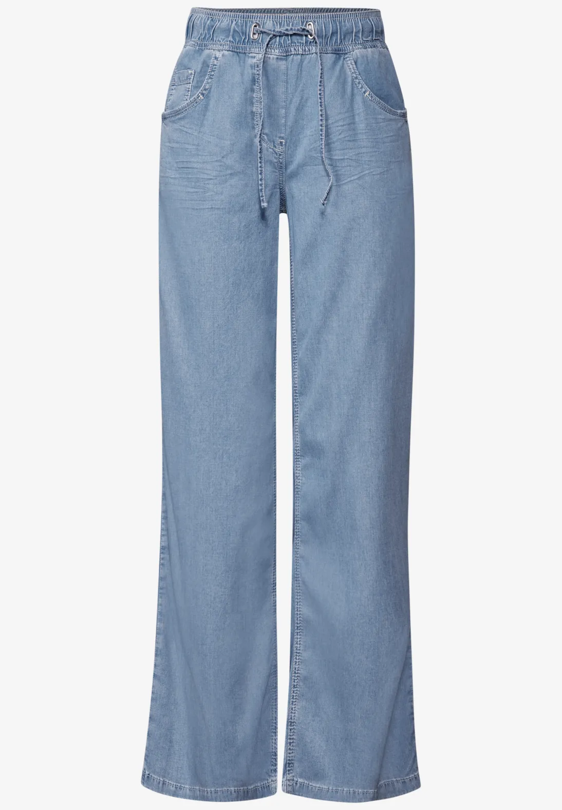 Cecil Neele. Cecil broek met een loose fit, hoge taille en wijde broekspijpen. Deze Cecil broek heeft een elastische tailleband, koordsluiting en steekzakken. De zomerse structuur maakt het geheel compleet.