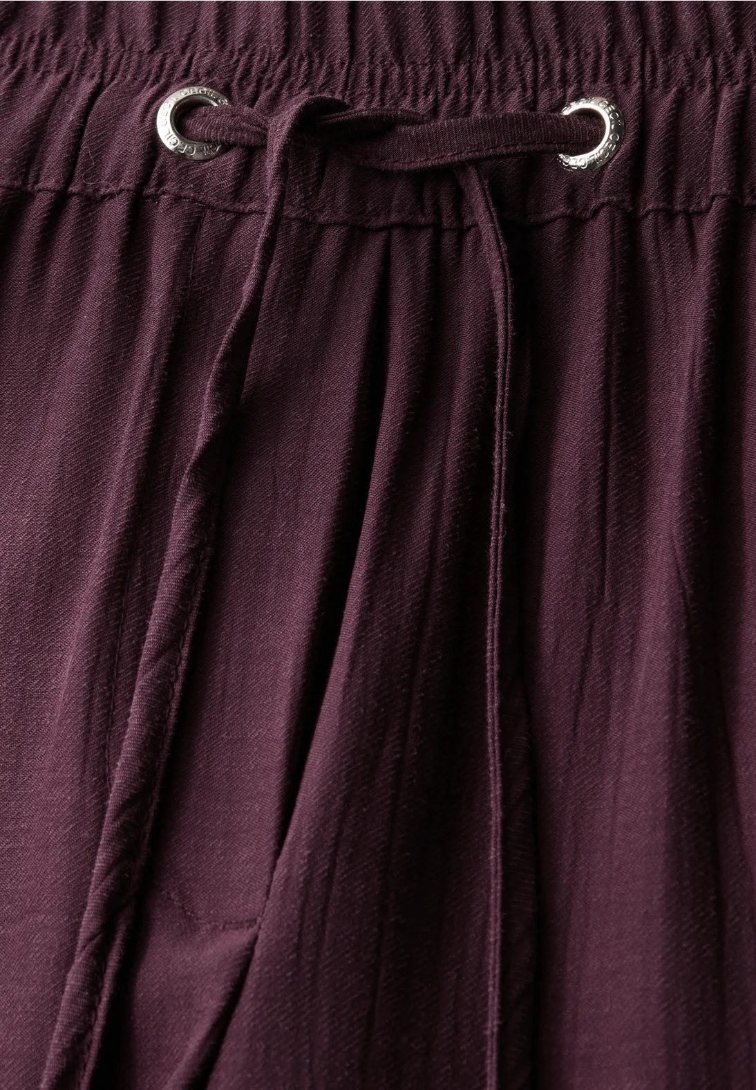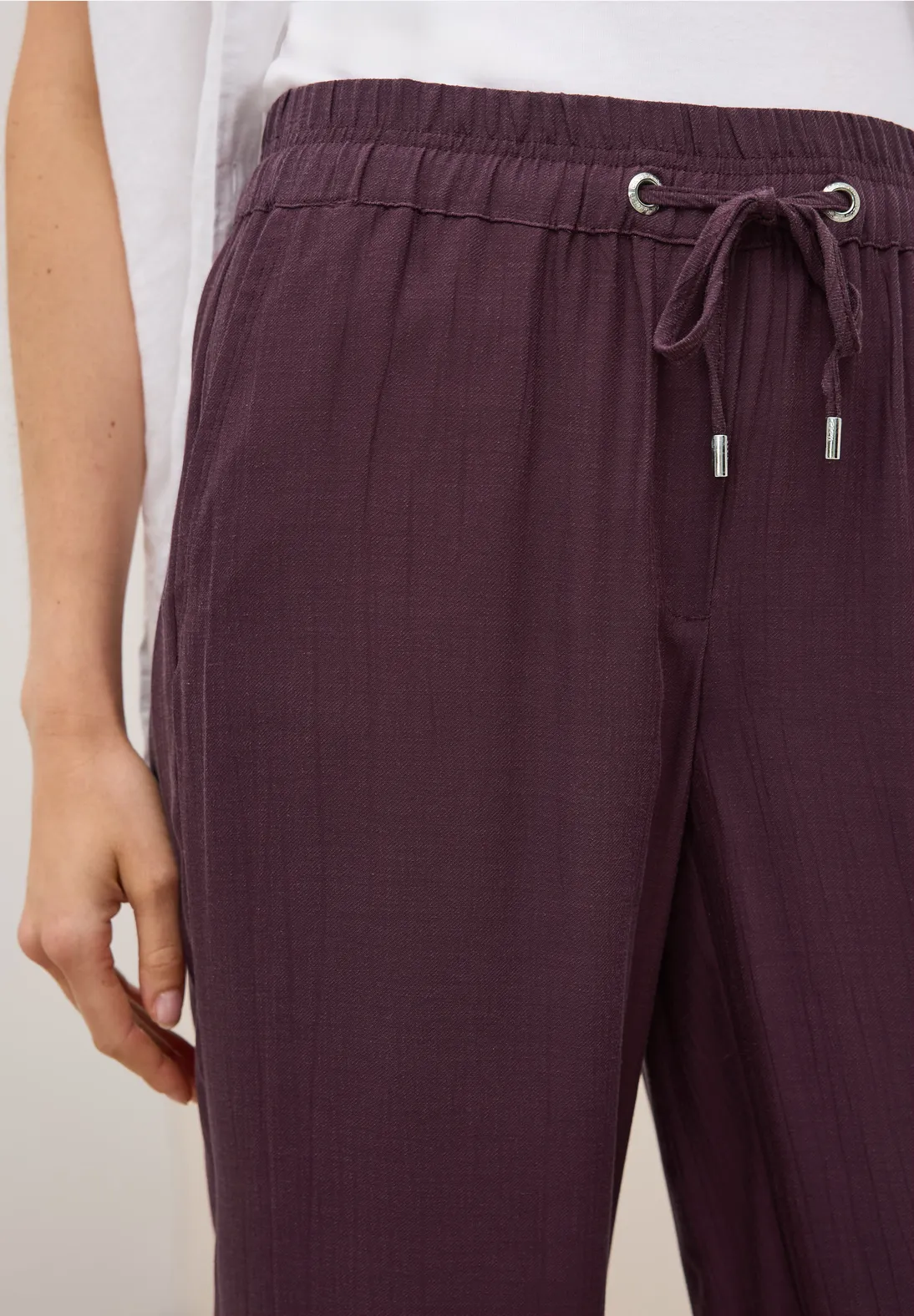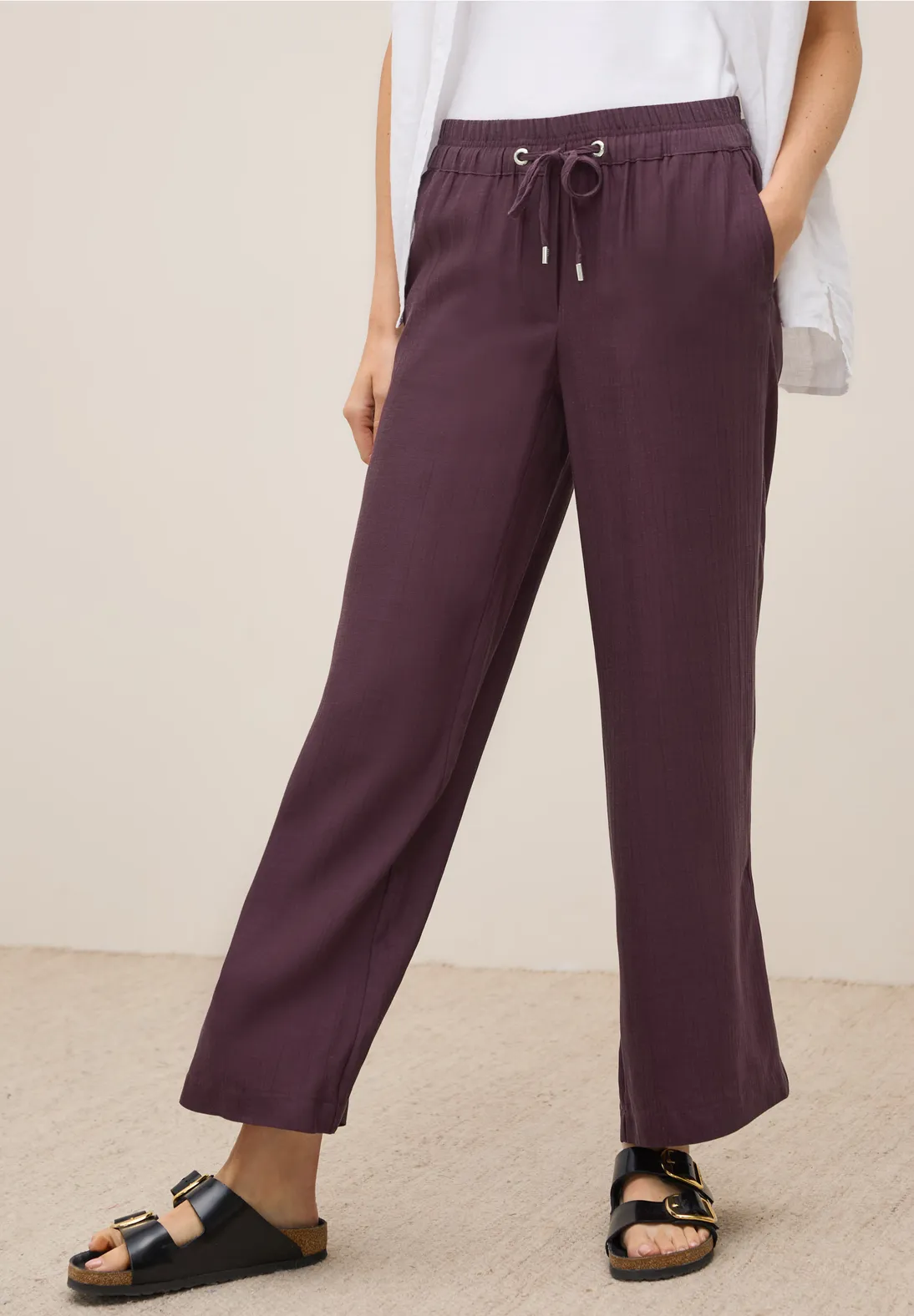Cecil Neele. Cecil broek met een loose fit, hoge taille en wijde broekspijpen. Deze Cecil broek heeft een allover structuur, een elastische tailleband en steekzakken.