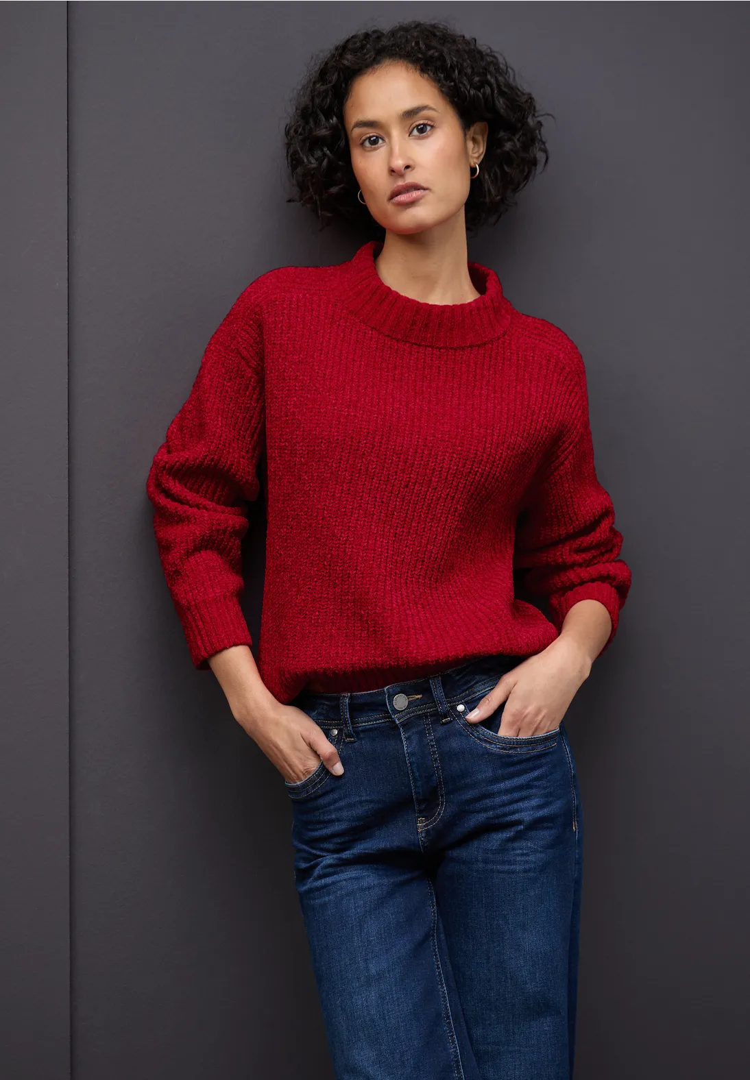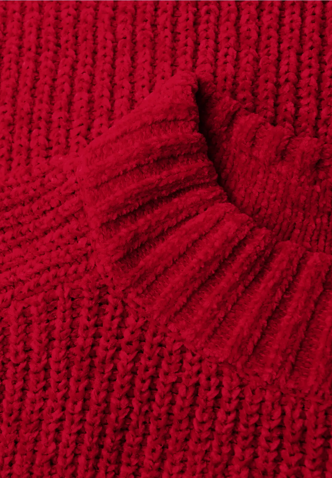 Deze gebreide trui van Street One in de kleur Racing Red is een must-have voor het seizoen. Gemaakt van zachte chenille stof voelt hij heerlijk comfortabel aan en geeft hij je outfit een vrouwelijke touch. De ronde hals, geribde boorden en getextureerde details op de mouwen zorgen voor een stijlvolle, maar casual look – perfect voor elke dag.